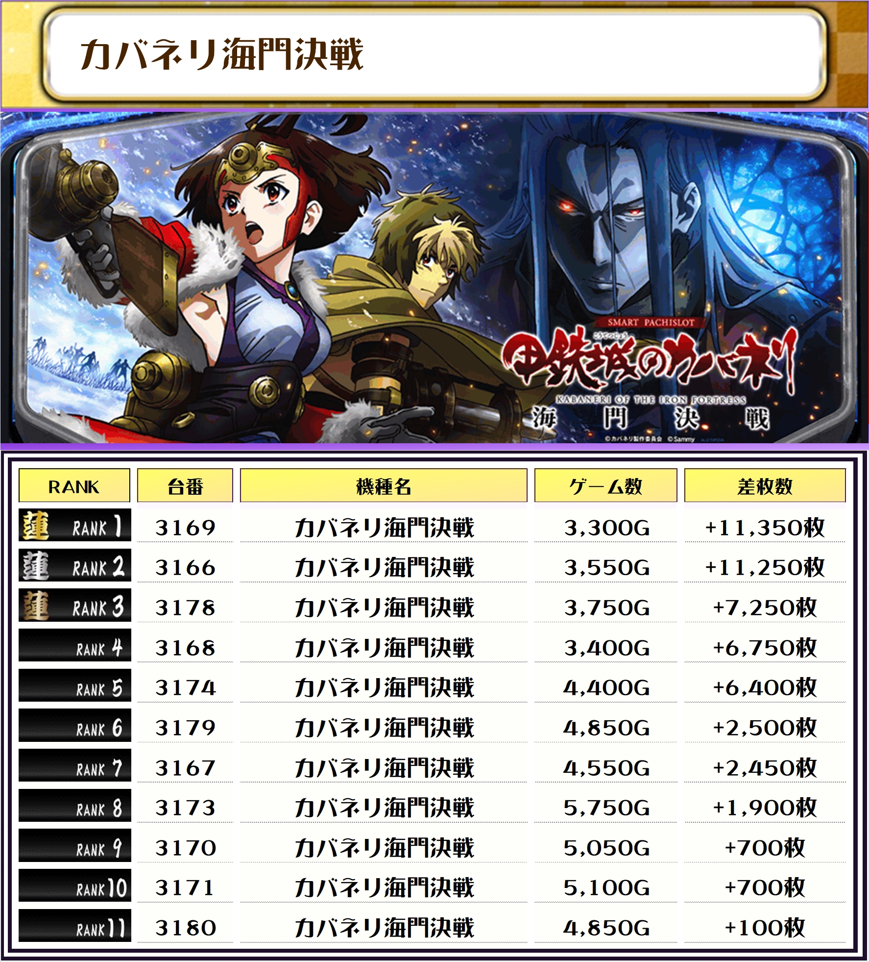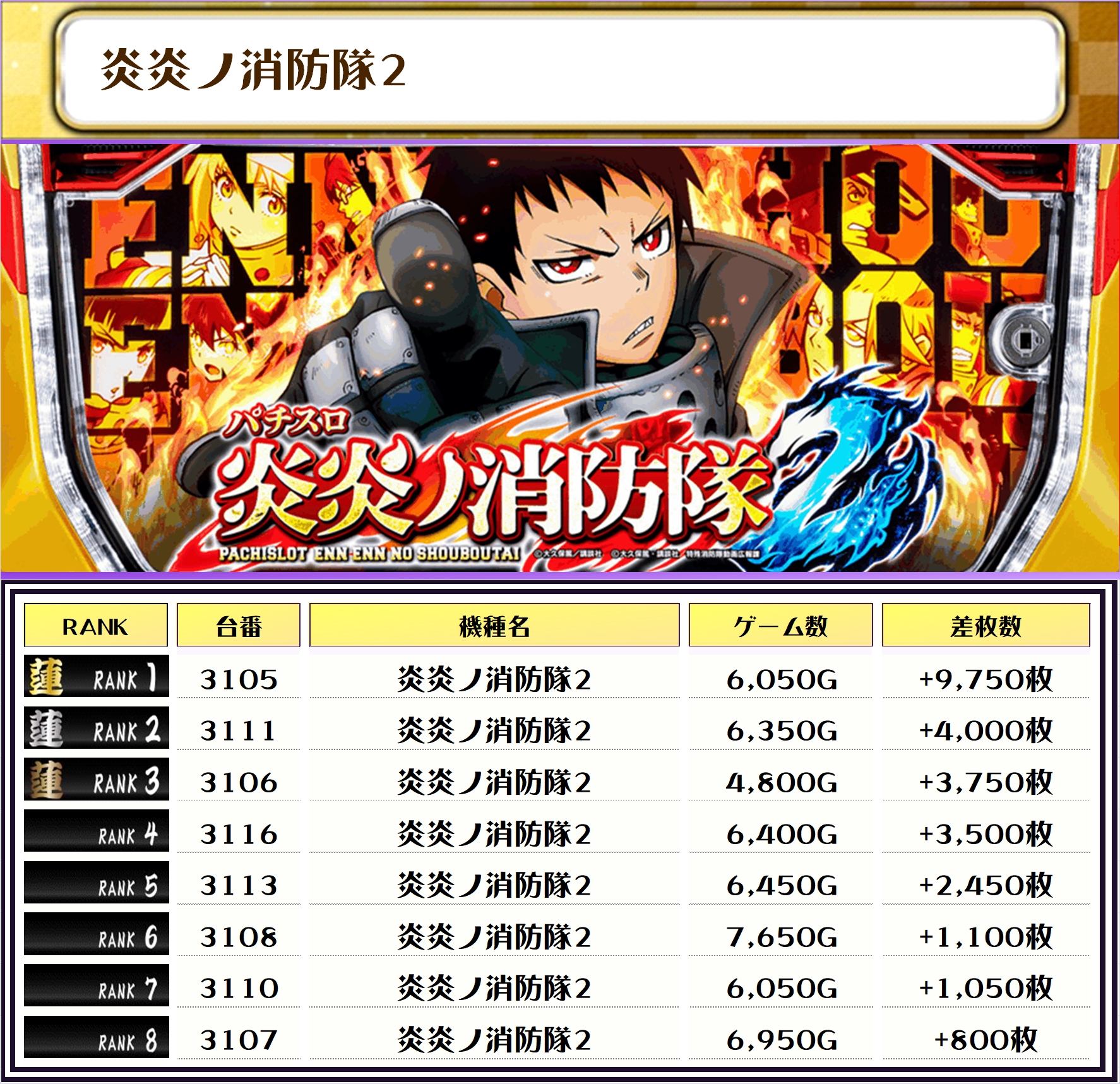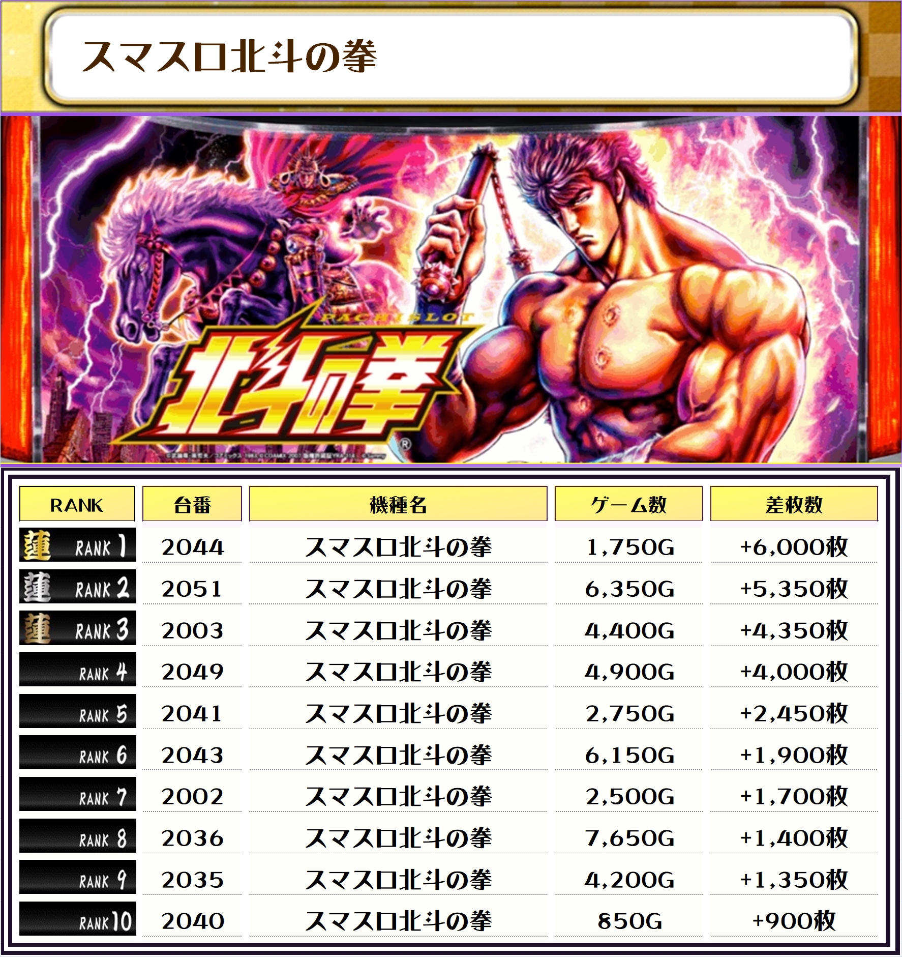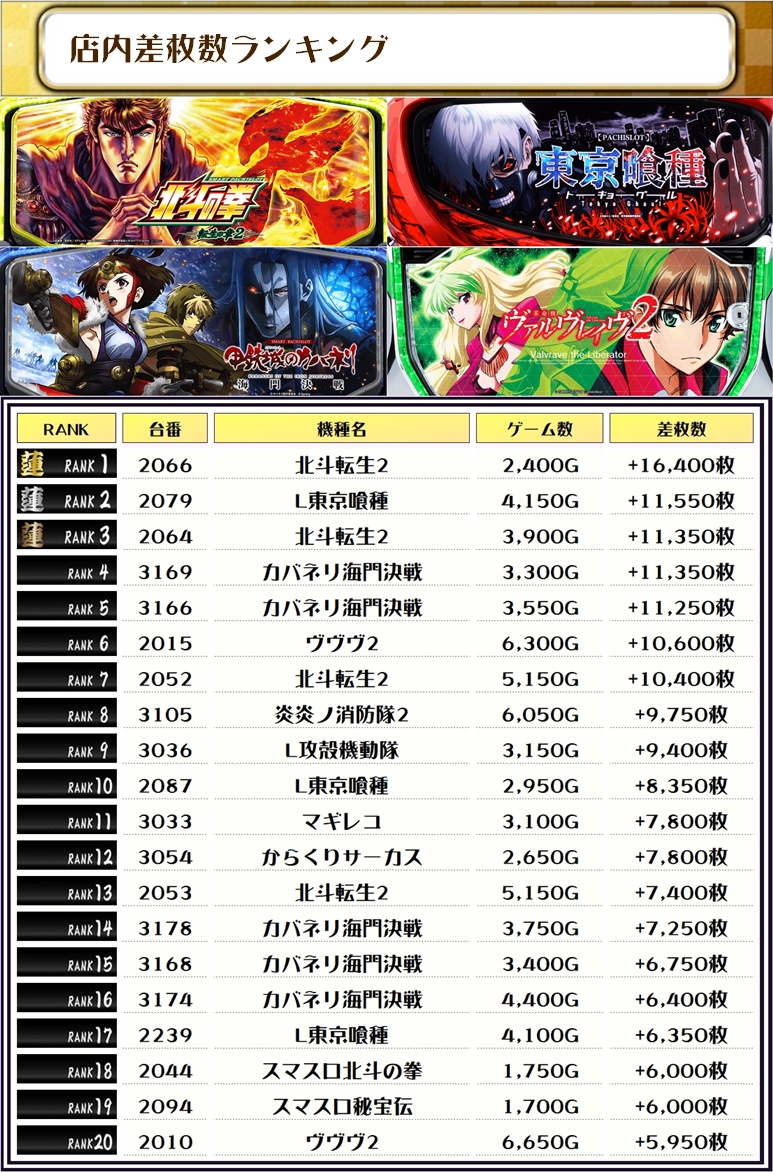 2位は【L東京喰種・2079番台】の+11,550枚、3位は北斗転生2・2064番台】の+11,350枚がランクインっ🏆🏆🏆