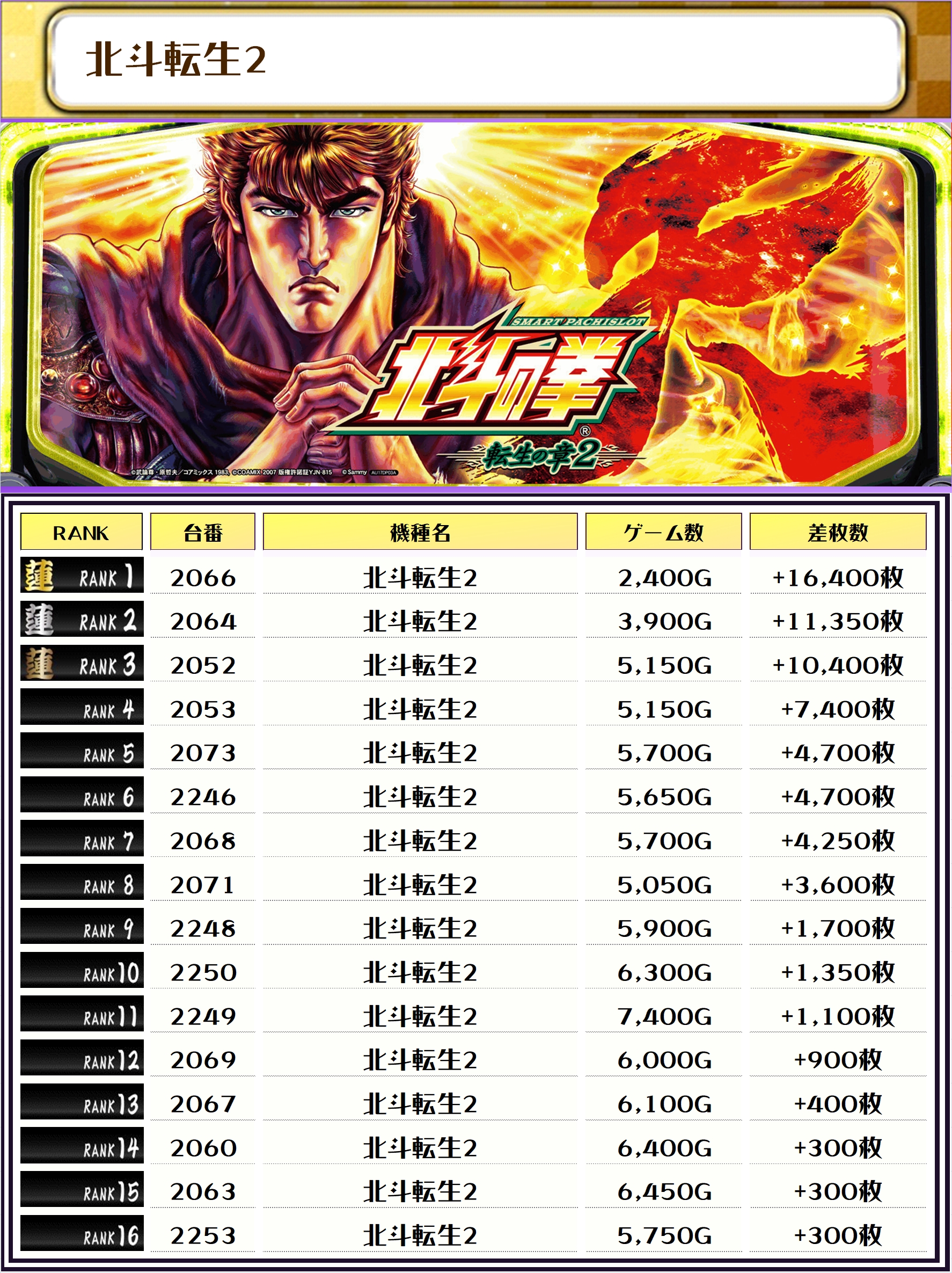 この日、全体の差枚トップに輝いたのは【北斗転生2・2066番台】の+16,400枚‼️