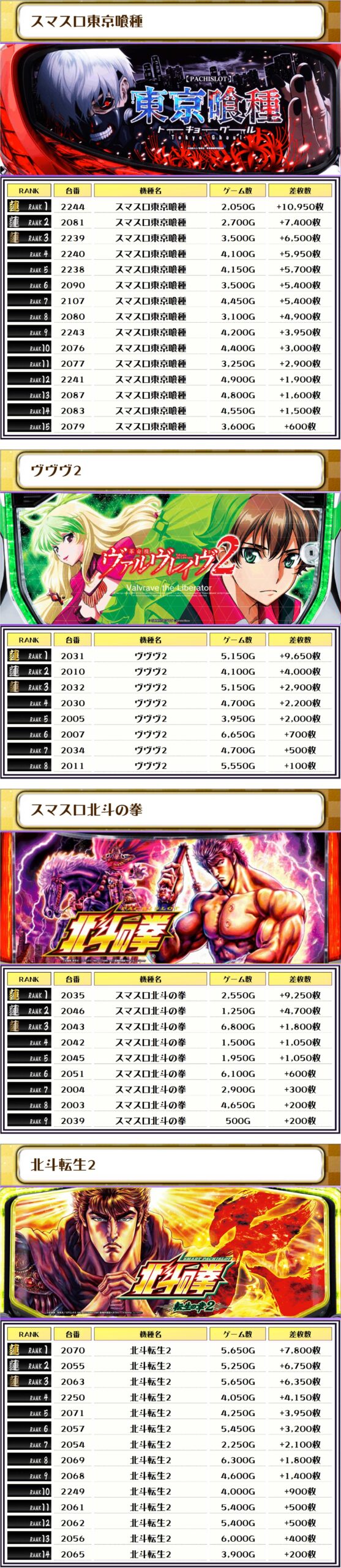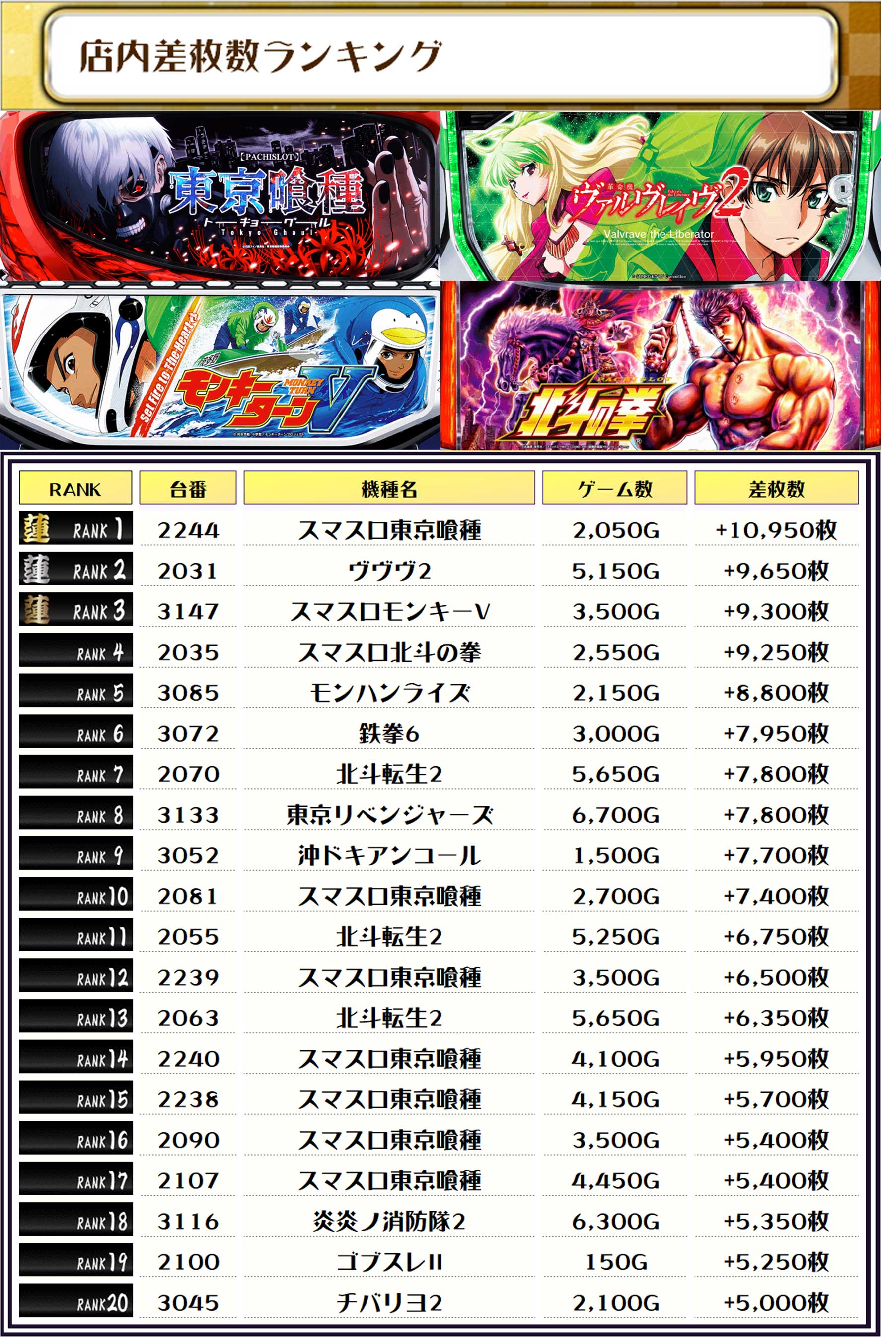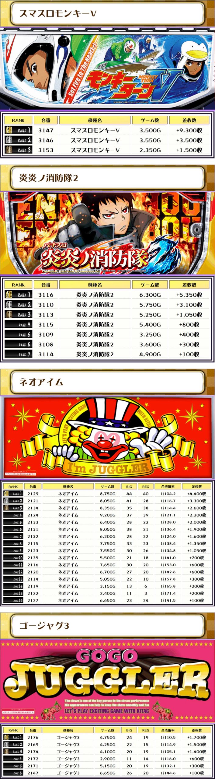 2位には【ヴヴヴ2・2031番台】の+9,650枚、そして3位には【スマスロモンキーV・3147番台】の+9,300枚がランクインっ🏆🏆🏆