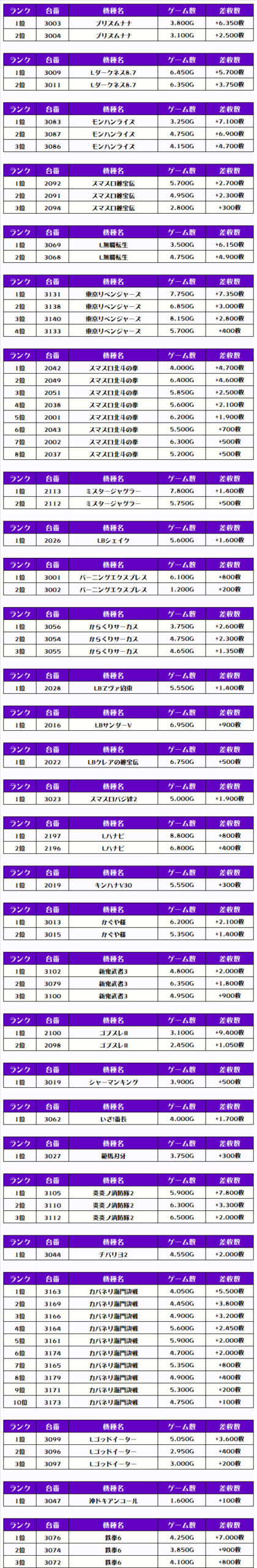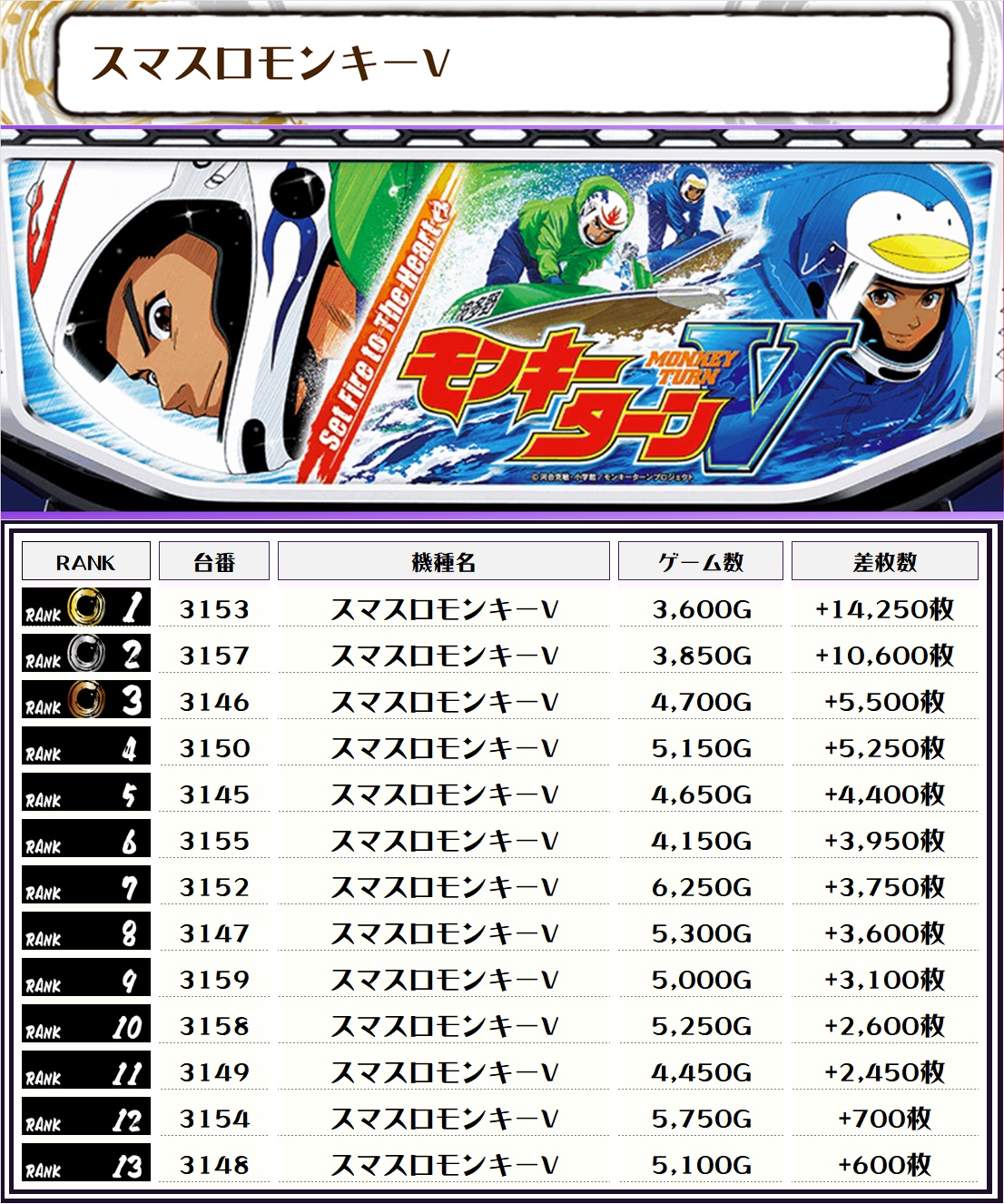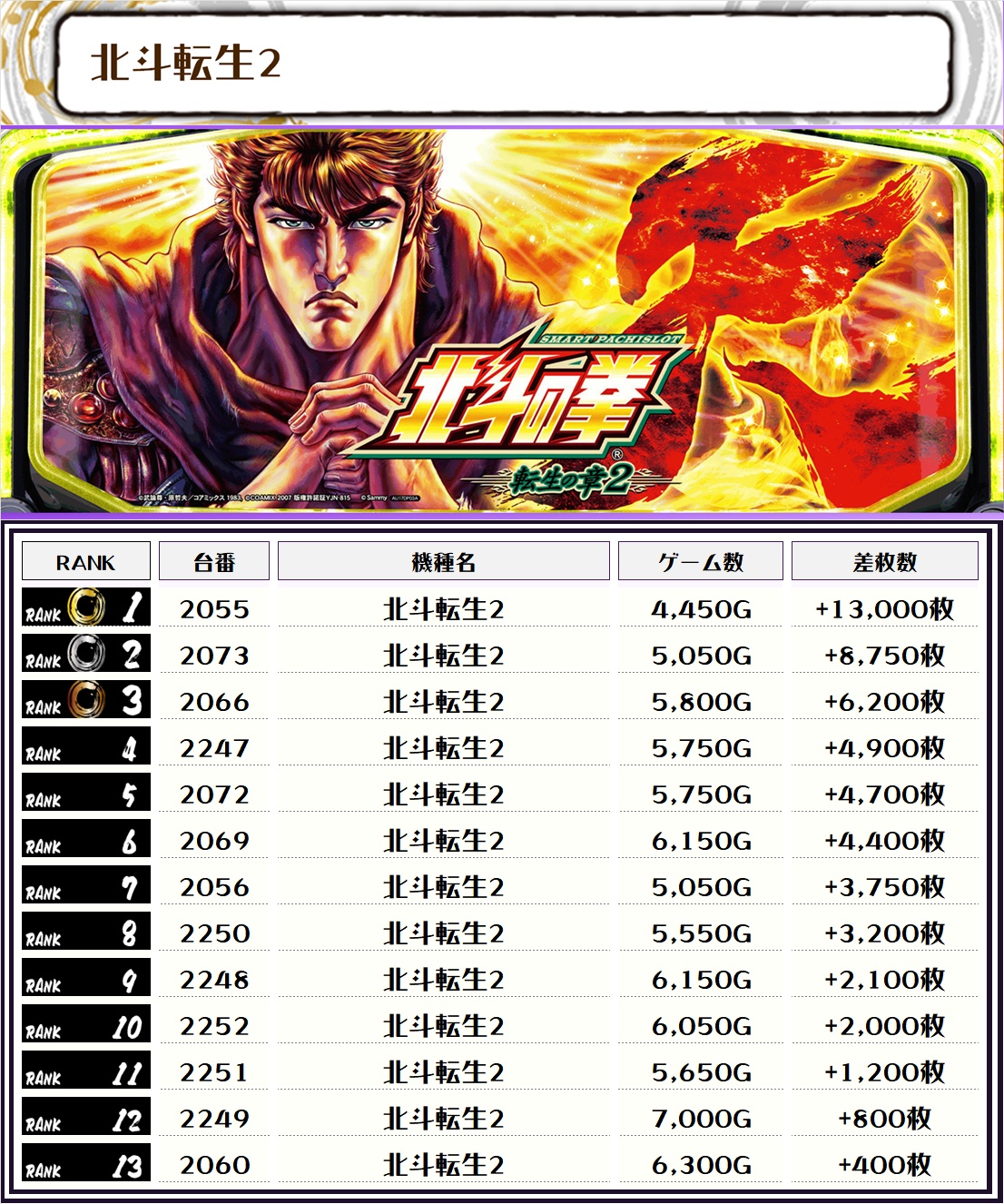 2位には【スマスロモンキーV・3153番台】の+14,250枚、3位は【北斗転生2・2055番台】の+13,000枚がランクインっ🏆🏆🏆