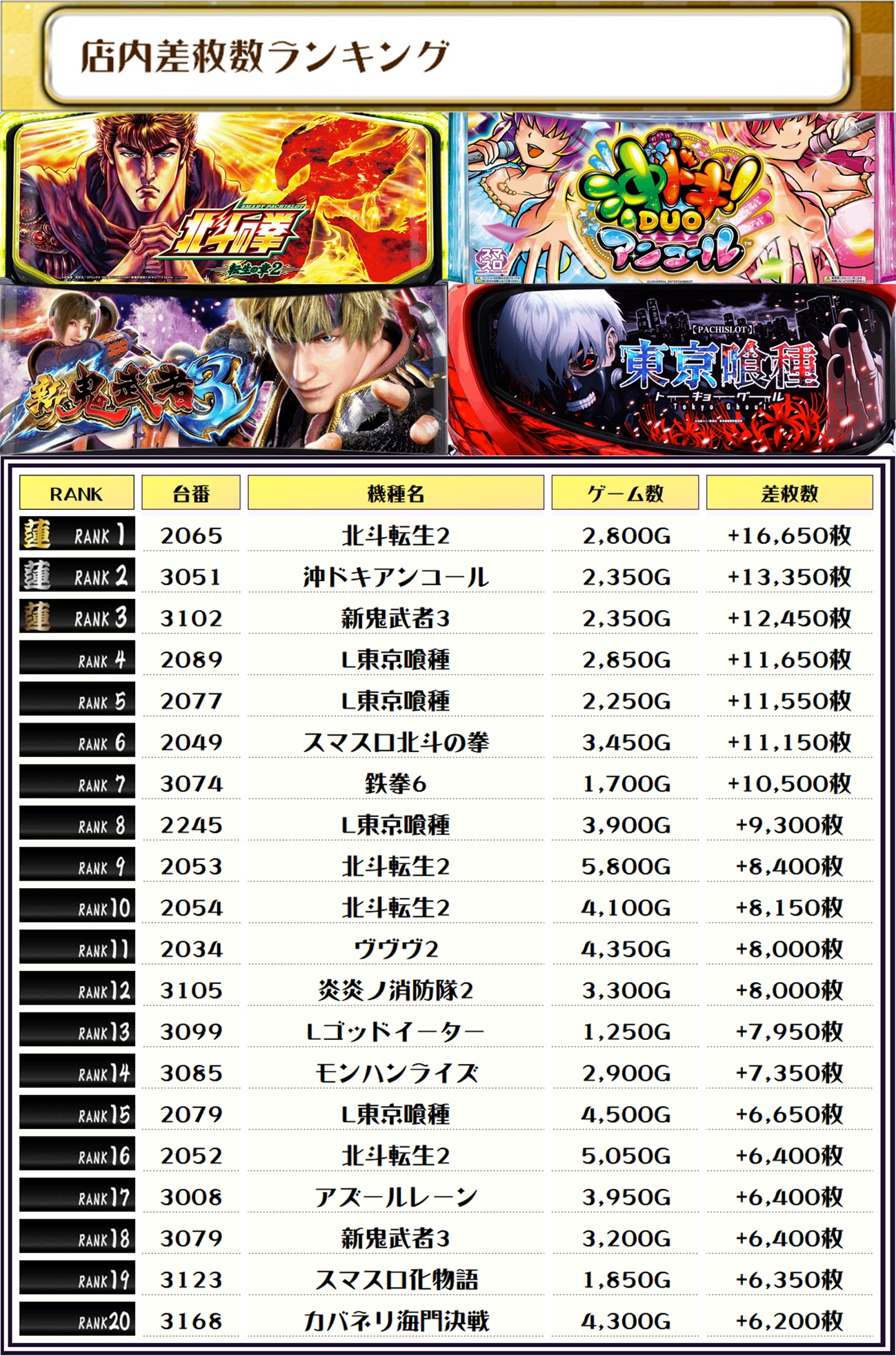 2位は【沖ドキアンコール・3051番台】の+13,350枚、3位は【新鬼武者3・3102番台】の+12,450枚がランクインっ🏆🏆🏆