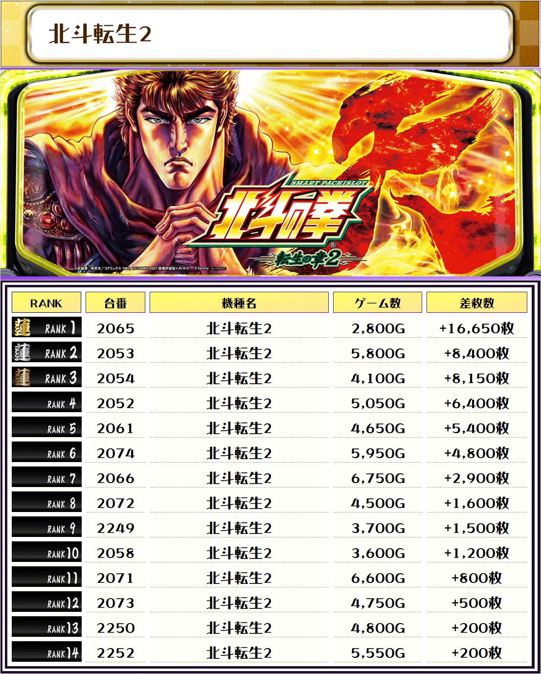 この日、全体の差枚トップに輝いたのは【北斗転生2・2065番台】の+16,650枚‼️