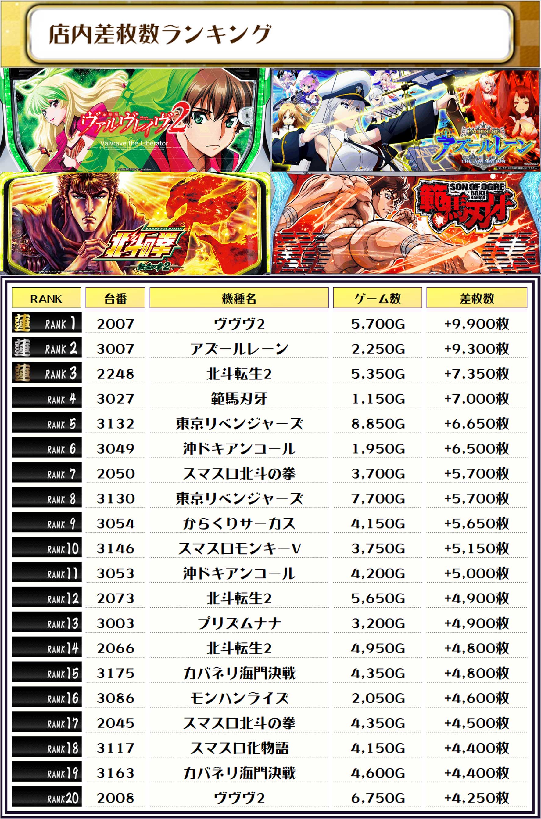 2位には【アズールレーン・3007番台】の+9,300枚、そして3位には【北斗転生2・2248番台】の+7,350枚がランクインっ🏆🏆🏆