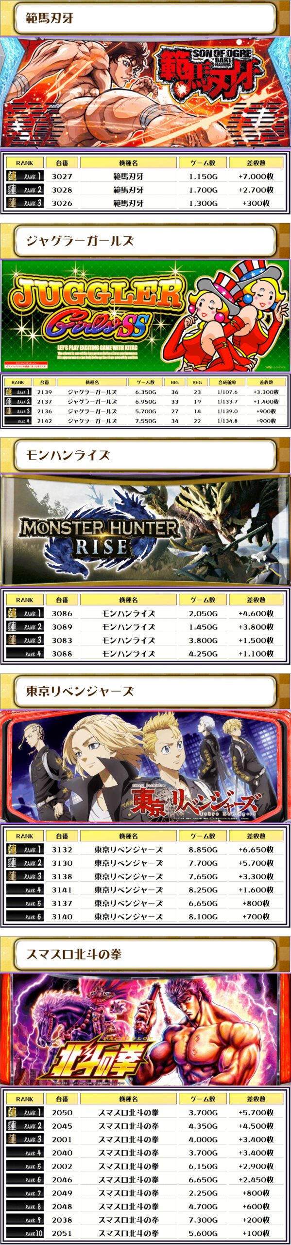 ジャグラーガールズ・モンハンライズ・東京リベンジャーズは特にその傾向が強そう💪💪💪