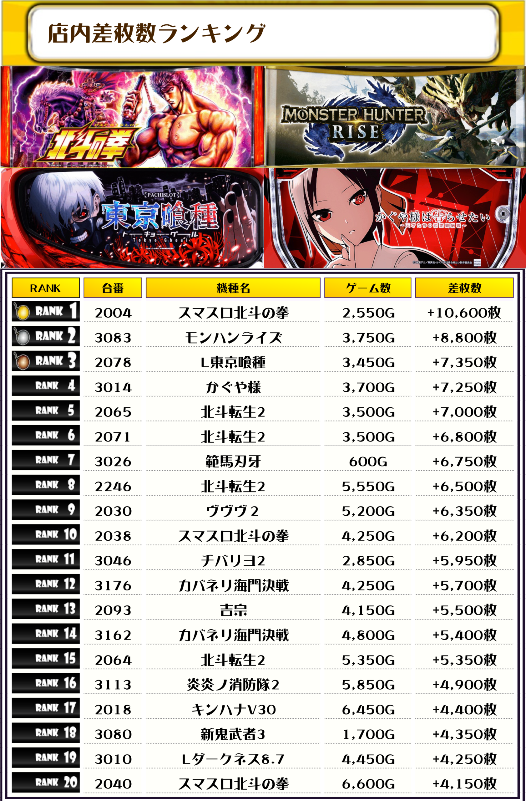 2位には【モンハンライズ・3083番台】の+8,800枚、3位には【L東京喰種・2078番台】の+7,350枚がランクインっ🏆🏆🏆🏆