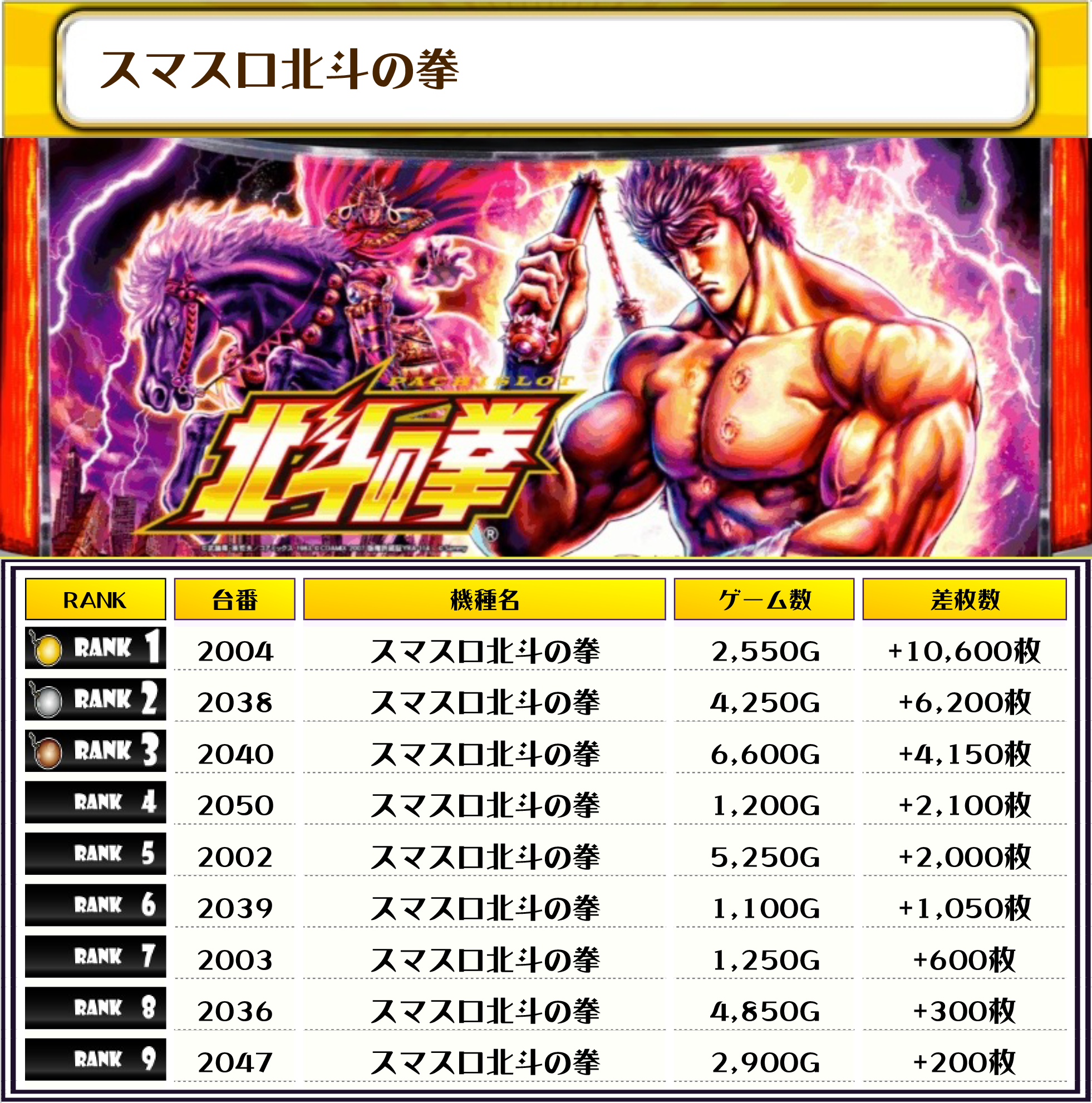 この日全体の差枚トップに輝いたのは【スマスロ北斗の拳・2004番台】の+10,600枚‼️