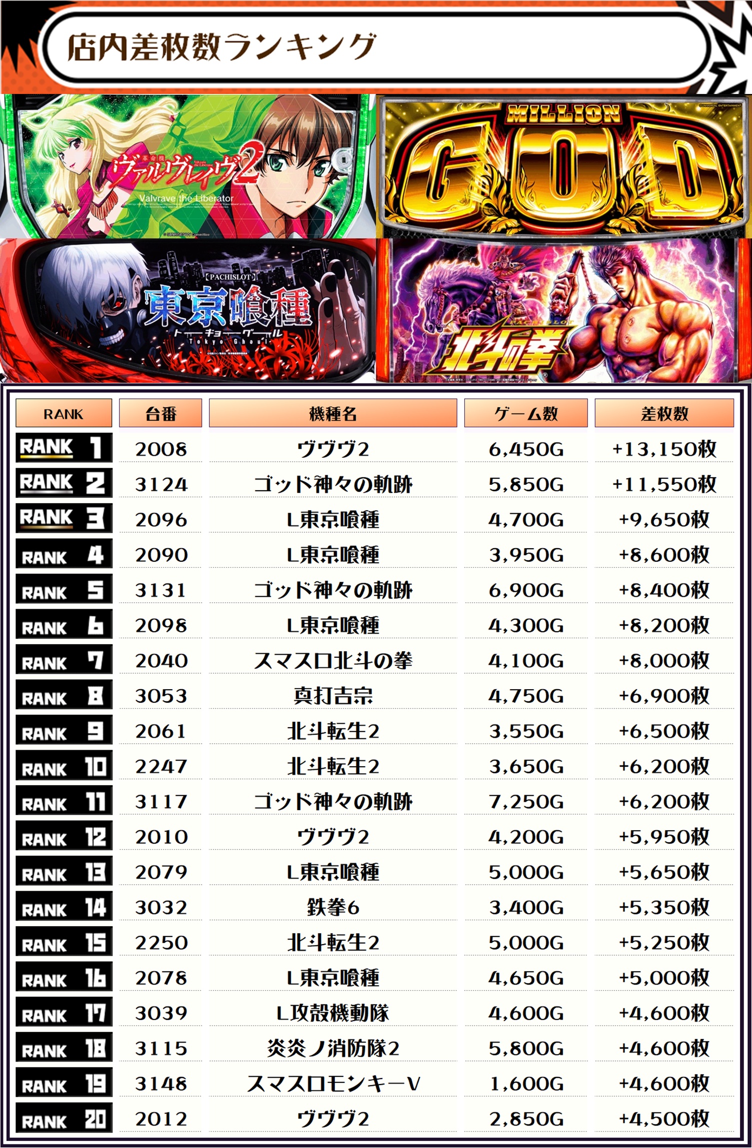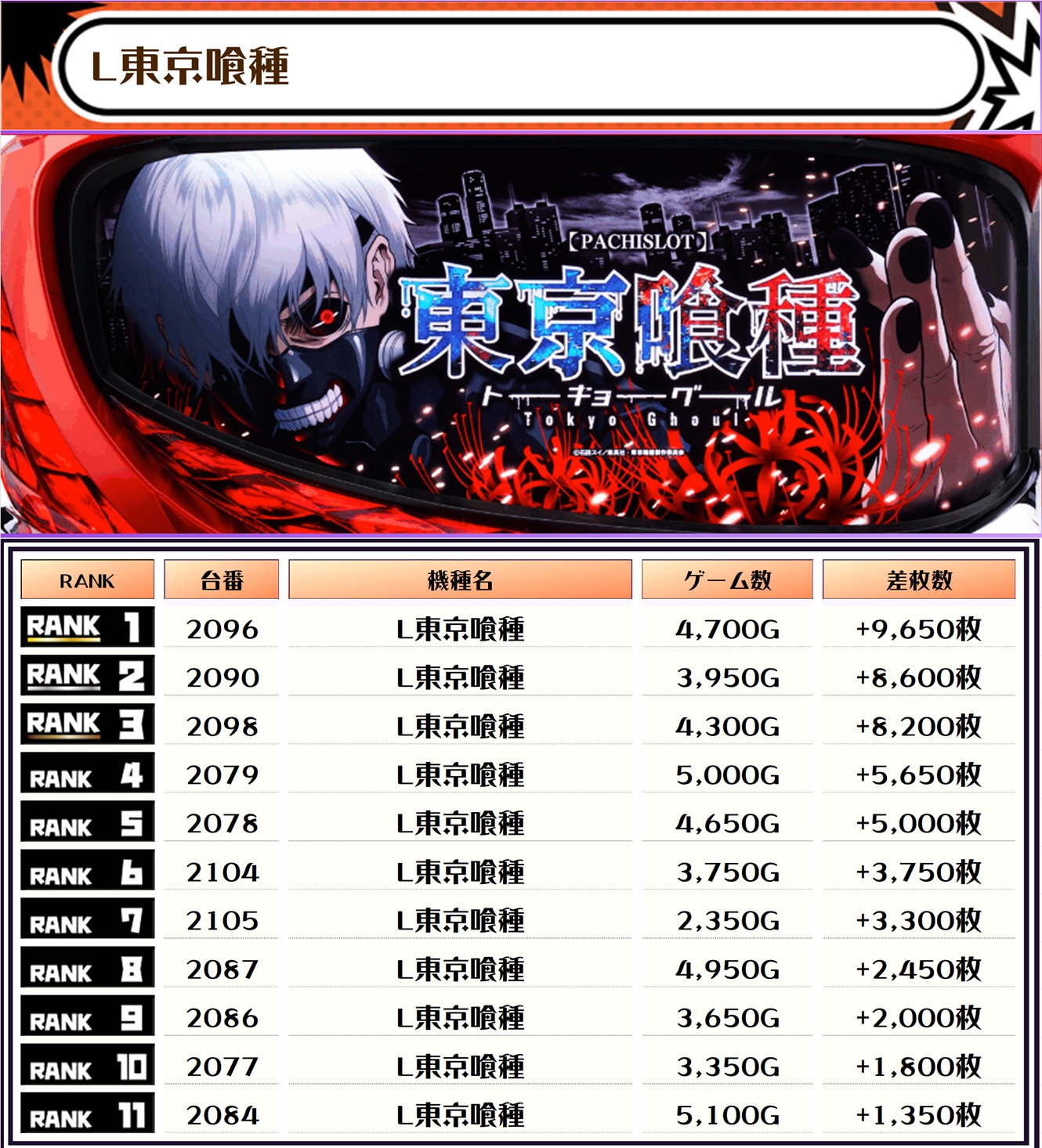 続く2位にも同じく【ゴッド神々の軌跡・3124番台】の+11,550枚、そして3位には【L東京喰種・2096番台】の+9,650枚がランクインっ🏆🏆🏆