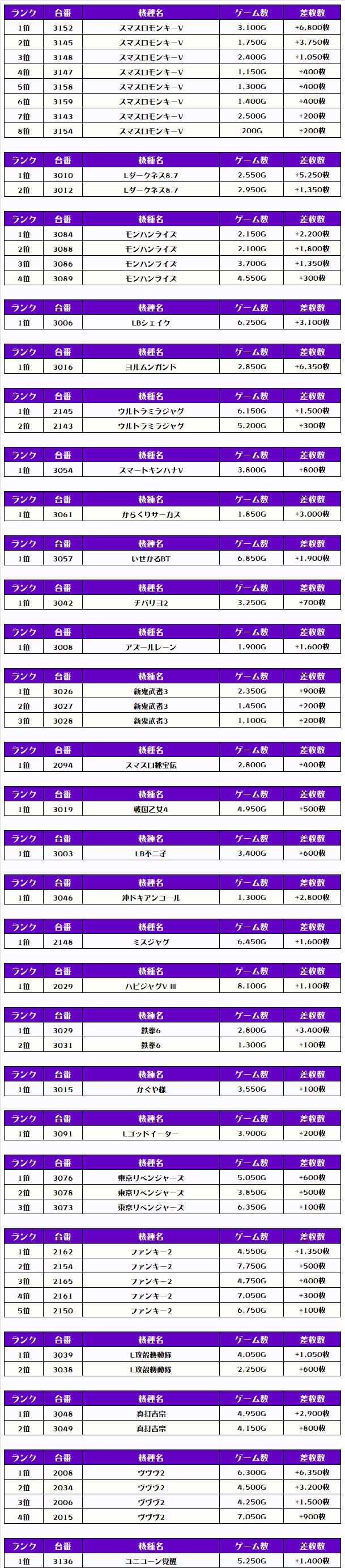 それでは、この日の【機種別差枚ランキング】を見ていきましょう❗️