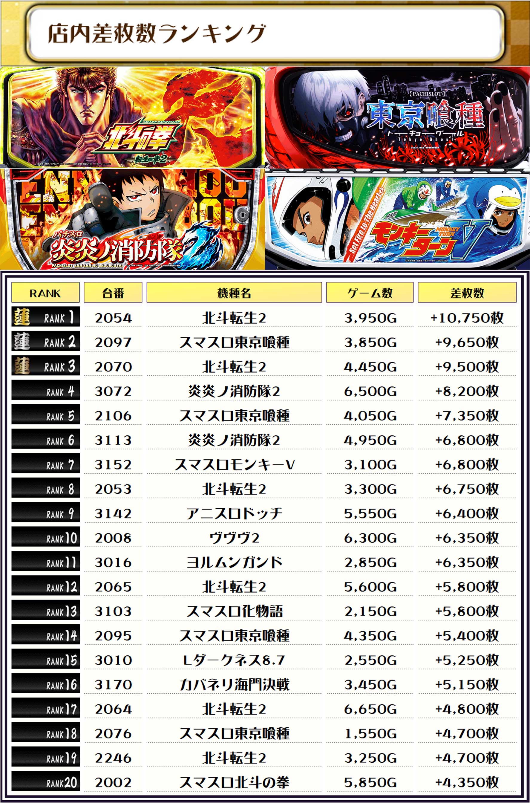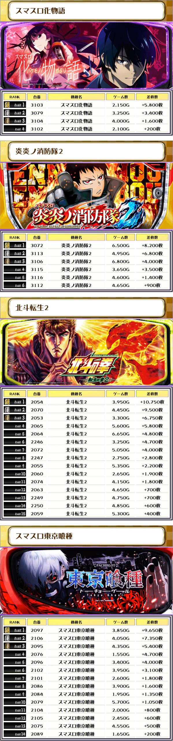 続く2位には【スマスロ東京喰種・2097番台】の+9,650枚、そして3位には【北斗転生2・2070番台】の+9,500枚がランクインっ🏆🏆🏆