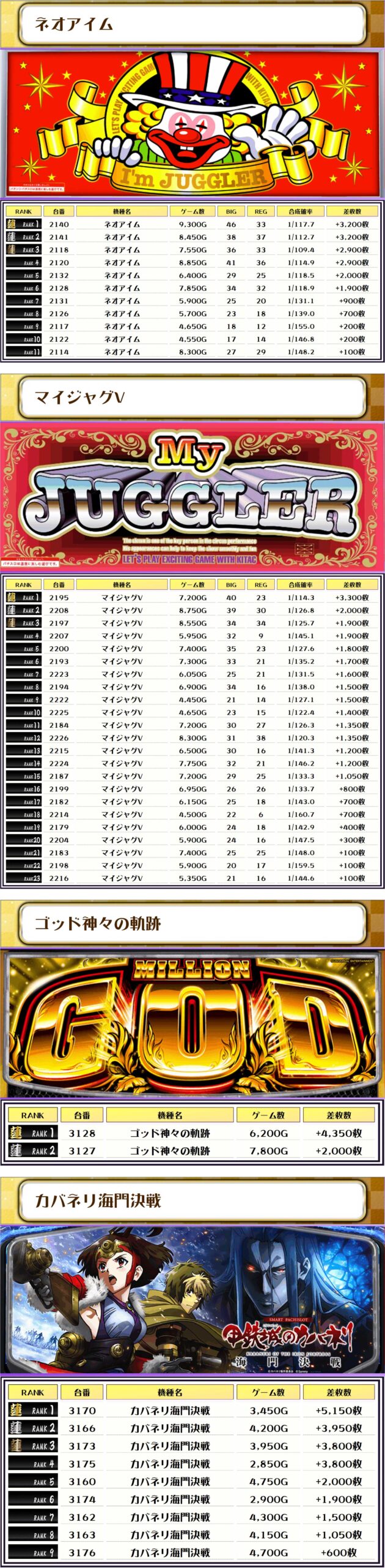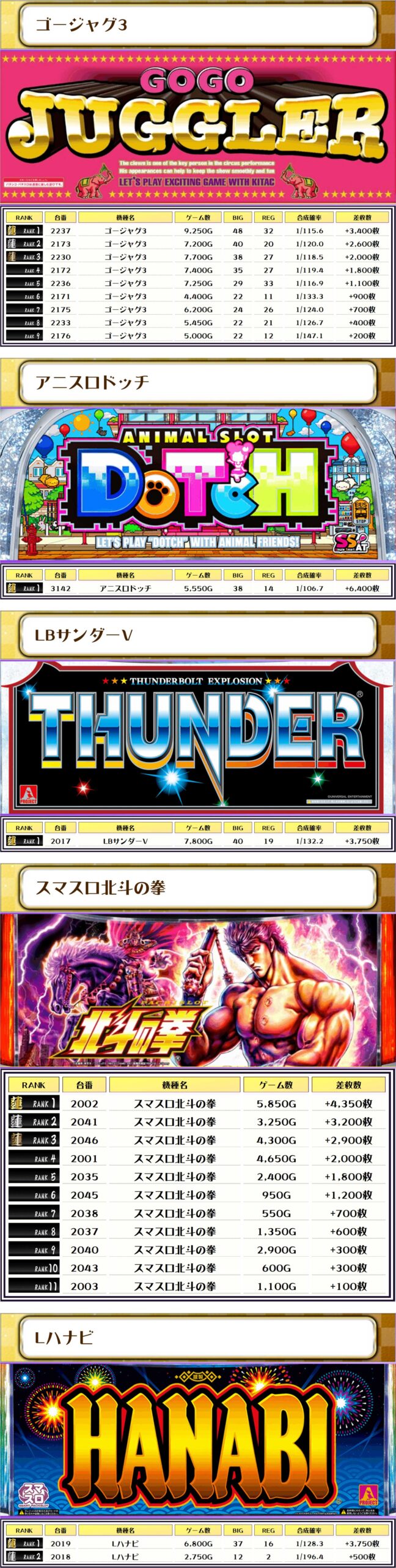 今回ピックアップしたのは、稼働が目立っていて優秀台が多かったと思われる機種になります🔍