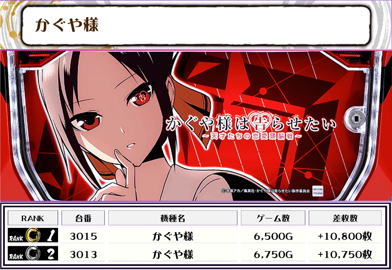 2位には【ヴヴヴ2・2030番台】の+11,550枚、3位は【かぐや様・3015番台】の+10,800枚がランクインっ🏆🏆🏆