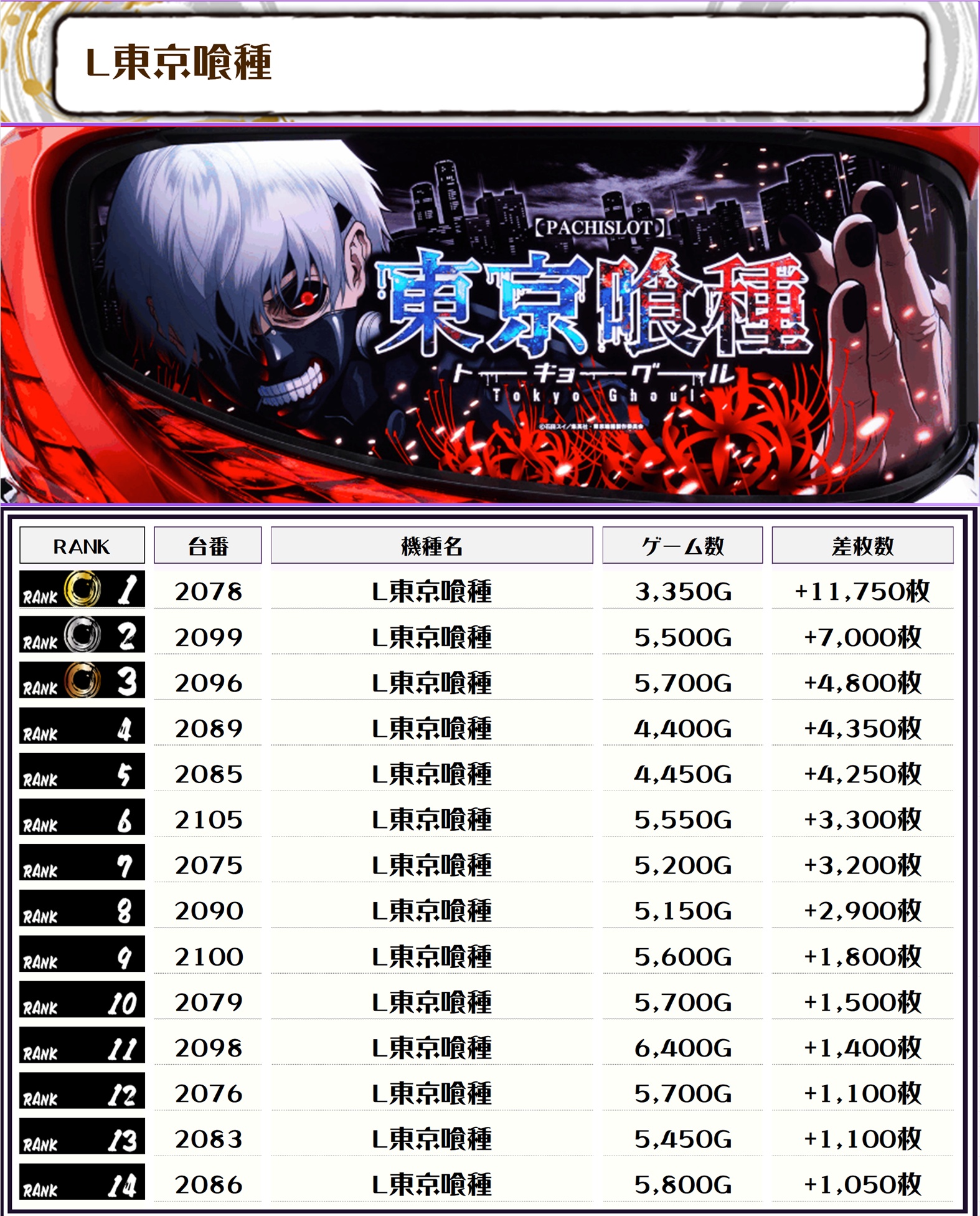 この日、全体の差枚トップに輝いたのは【L東京喰種・2078番台】の+11,750枚‼️おめでとうございます💥💥💥