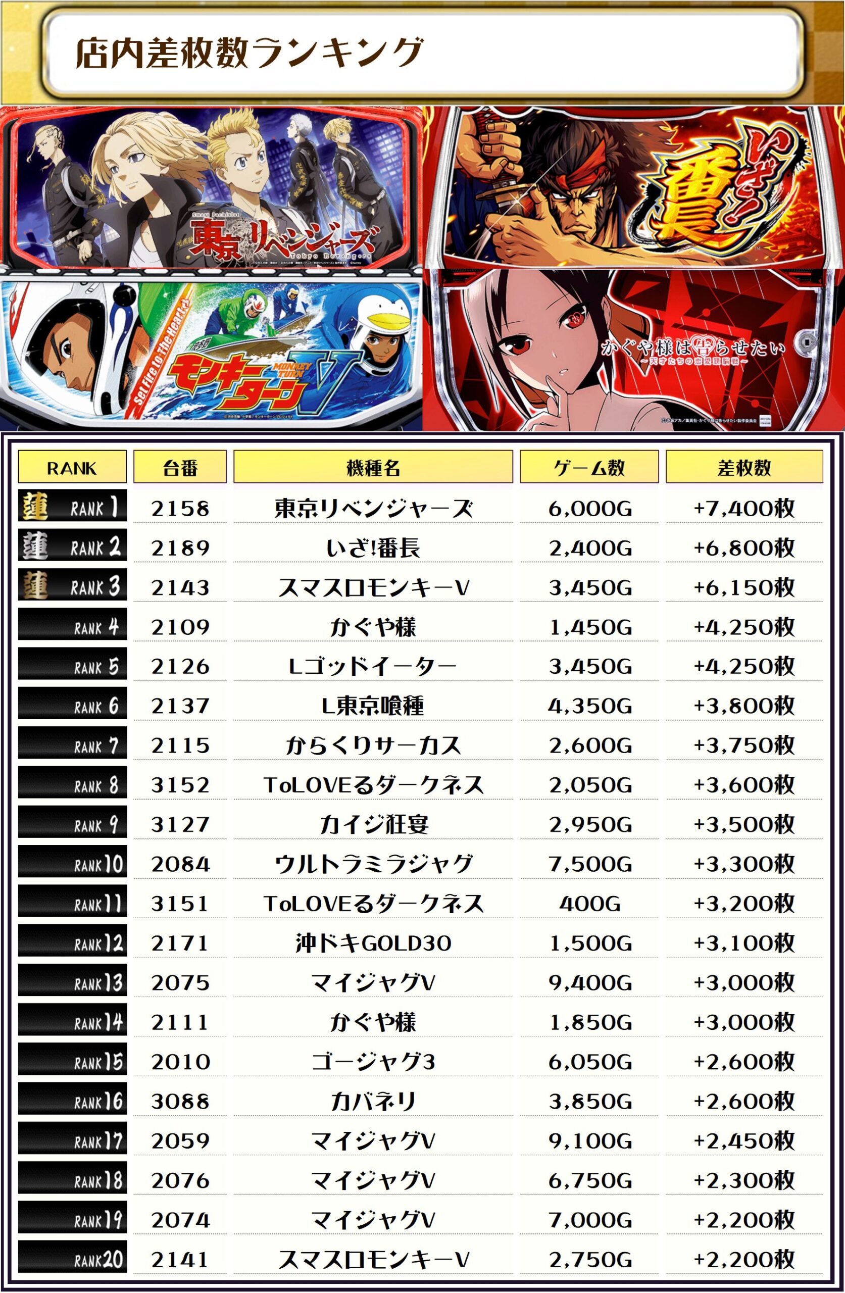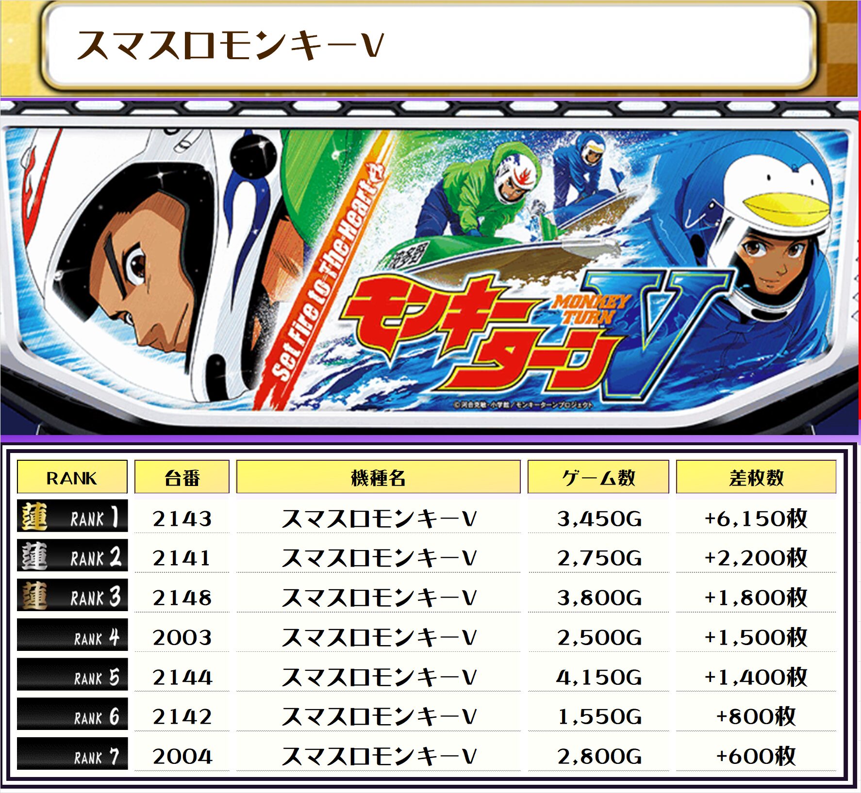 2位には【いざ!番長・2189番台】の+6,800枚、そして3位には【スマスロモンキーV・2143番台】の+6,150枚がランクインっ🏆🏆🏆🏆