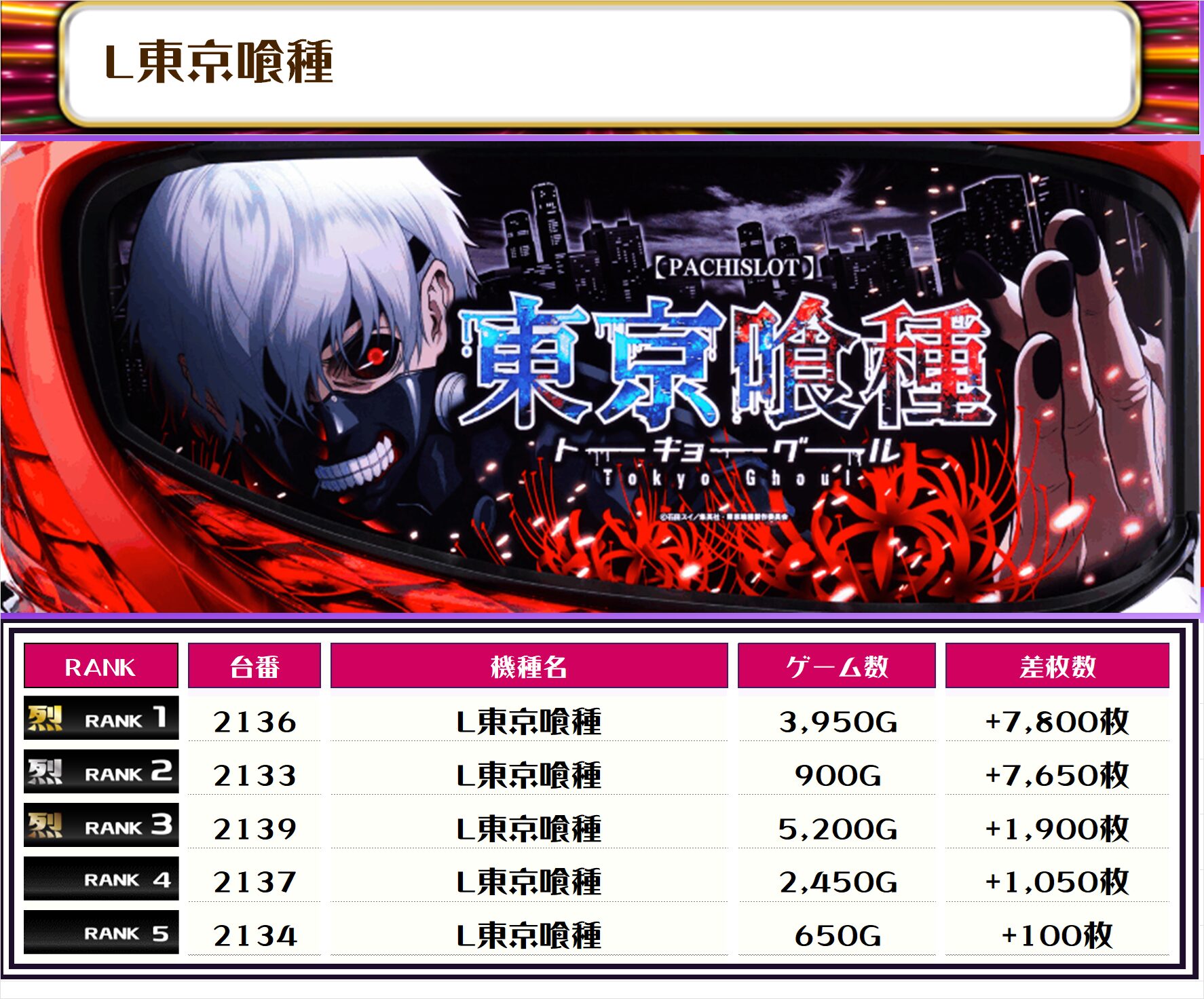 2位には【L東京喰種・2136番台】の+7,800枚、3位にも【L東京喰種・2133番台】の+7,650枚がランクインっ🏆🏆🏆🏆