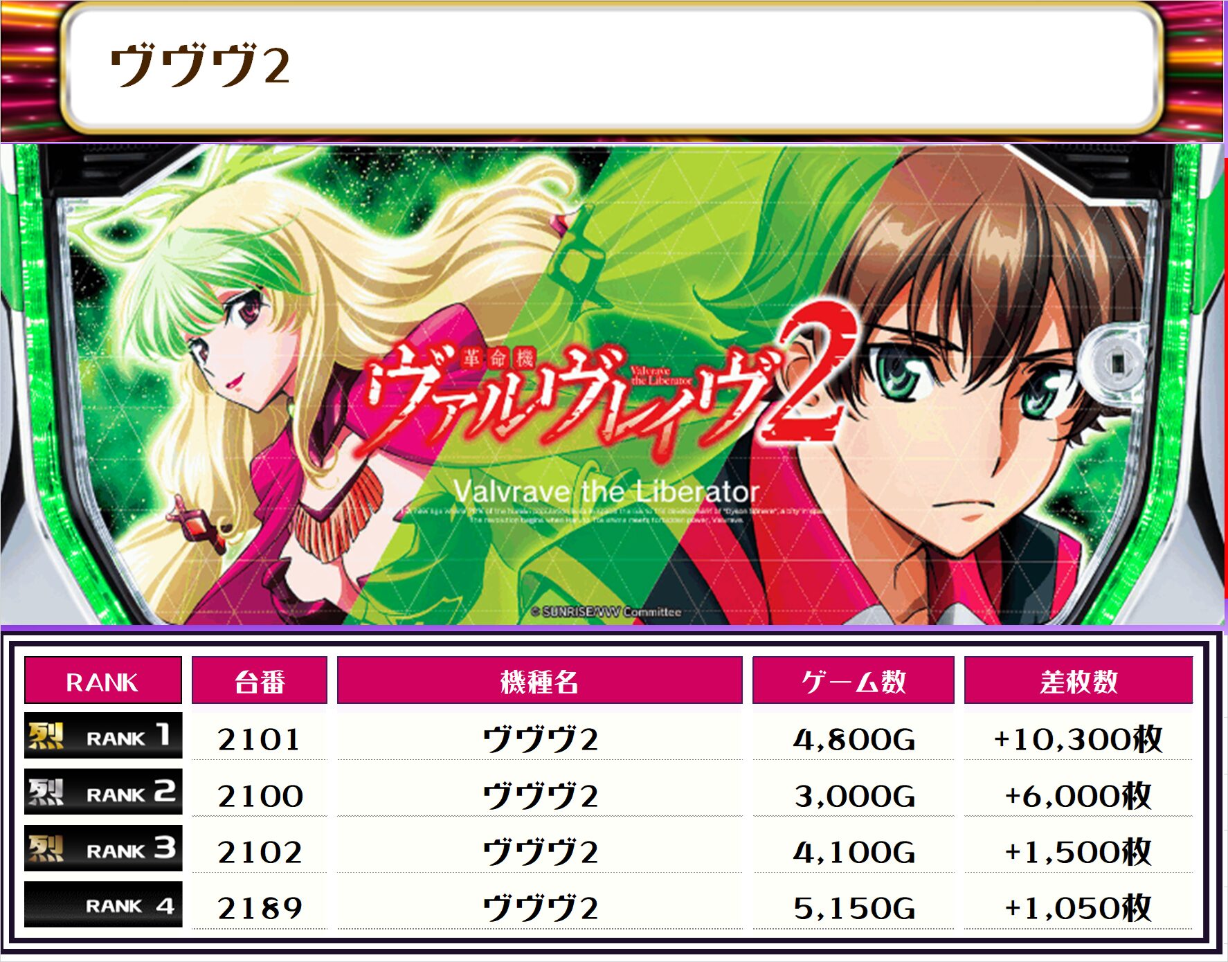 この日、全体の差枚トップに輝いたのは【ヴヴヴ2・2101番台】の+10,300枚‼️