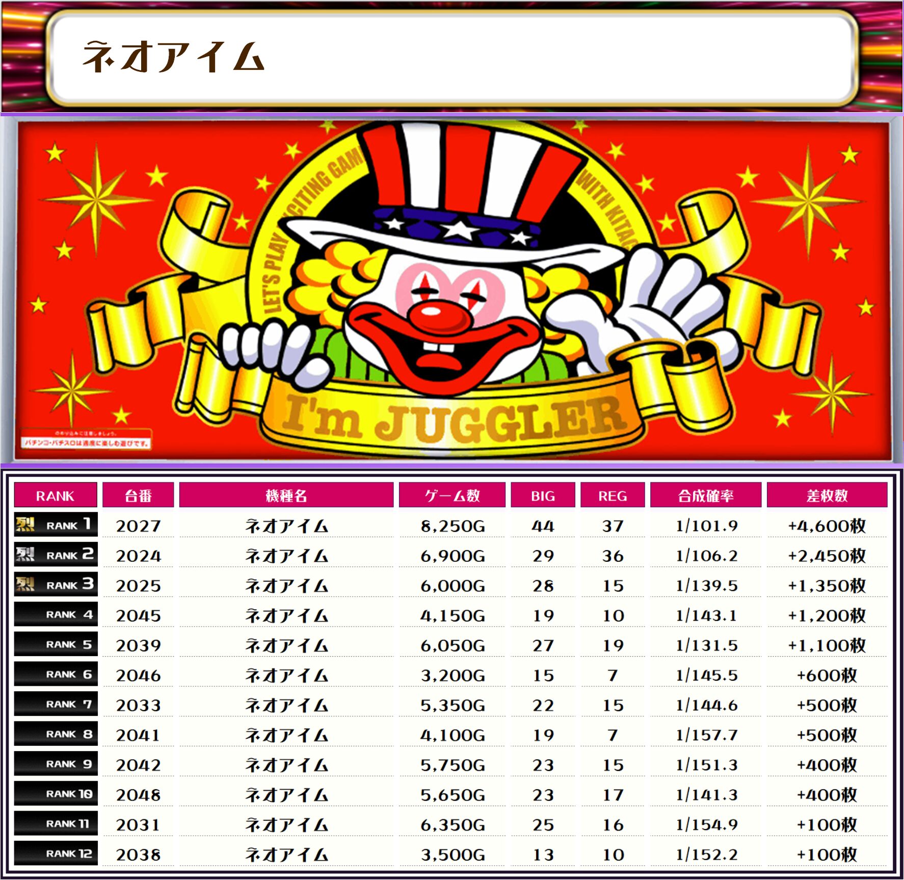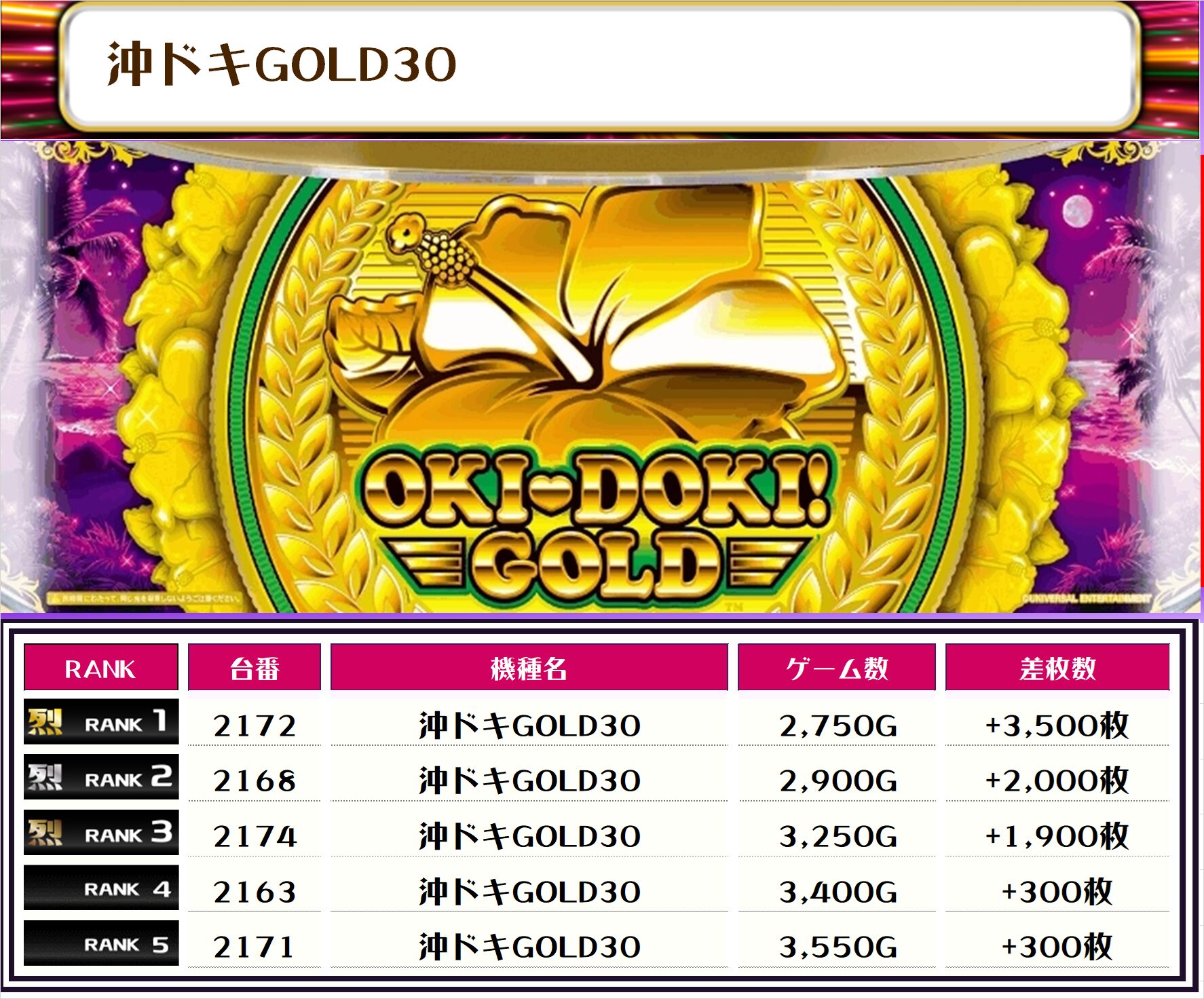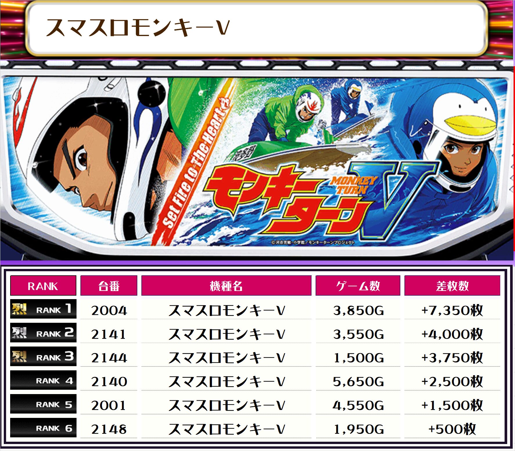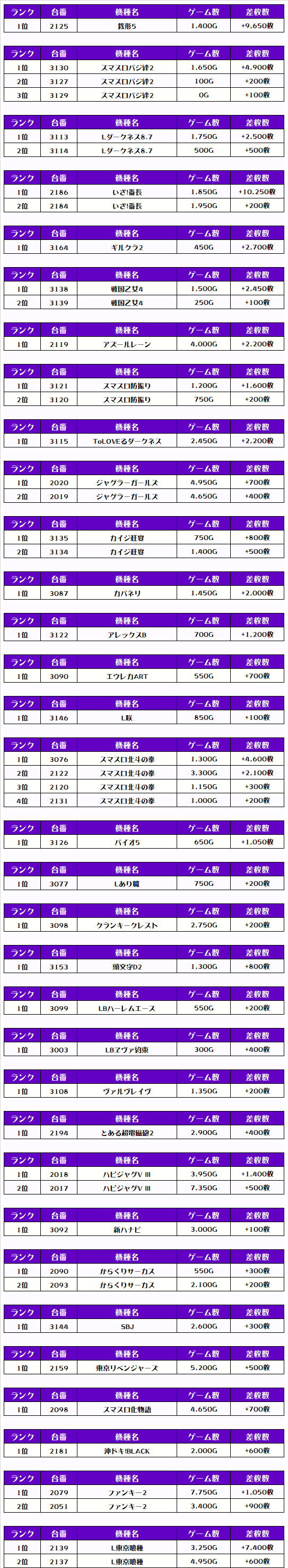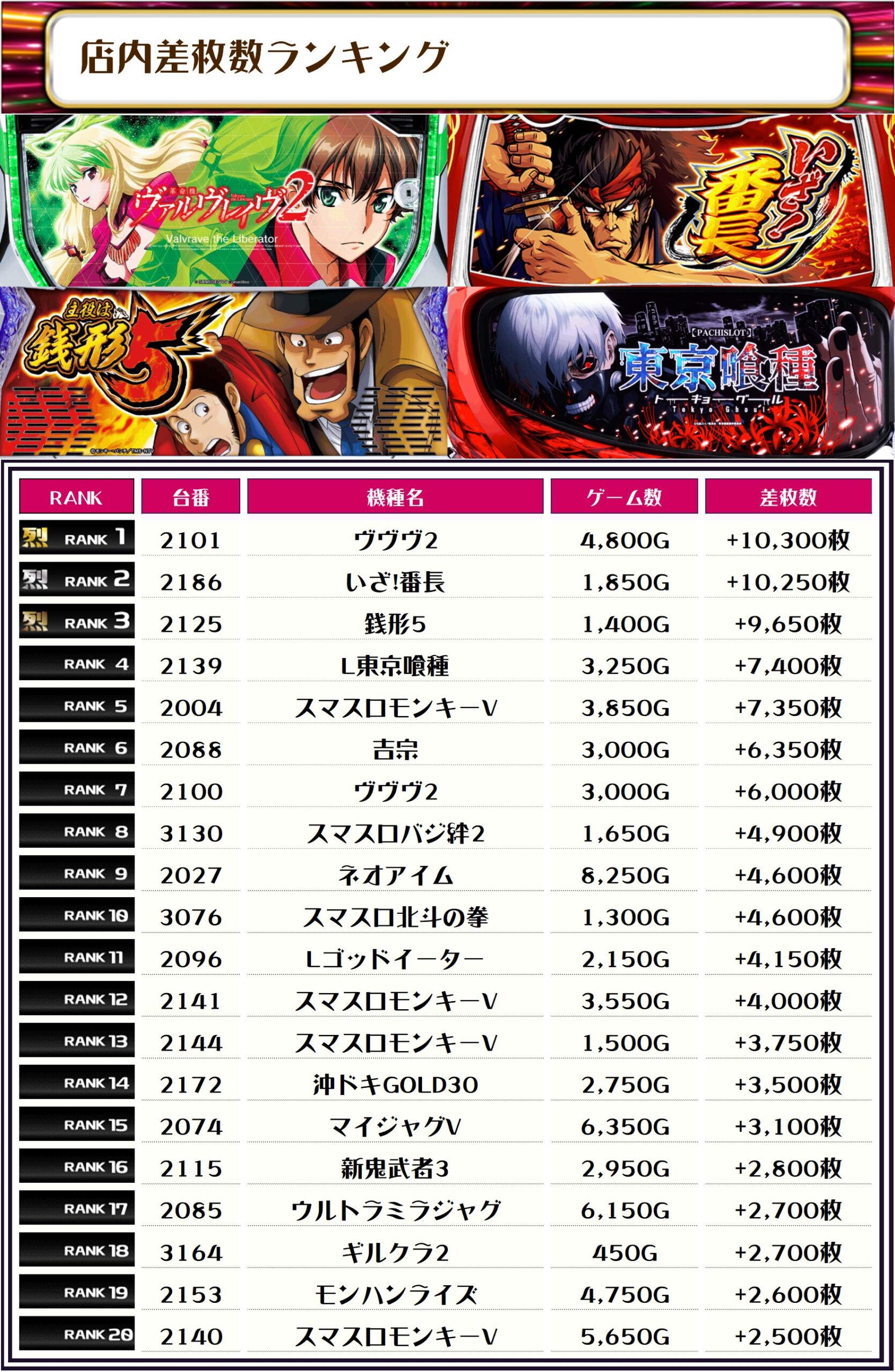 2位には【いざ!番長・2186番台】の+10,250枚、3位には【銭形5・2125番台】の+9,650枚がランクインっ🏆🏆🏆🏆