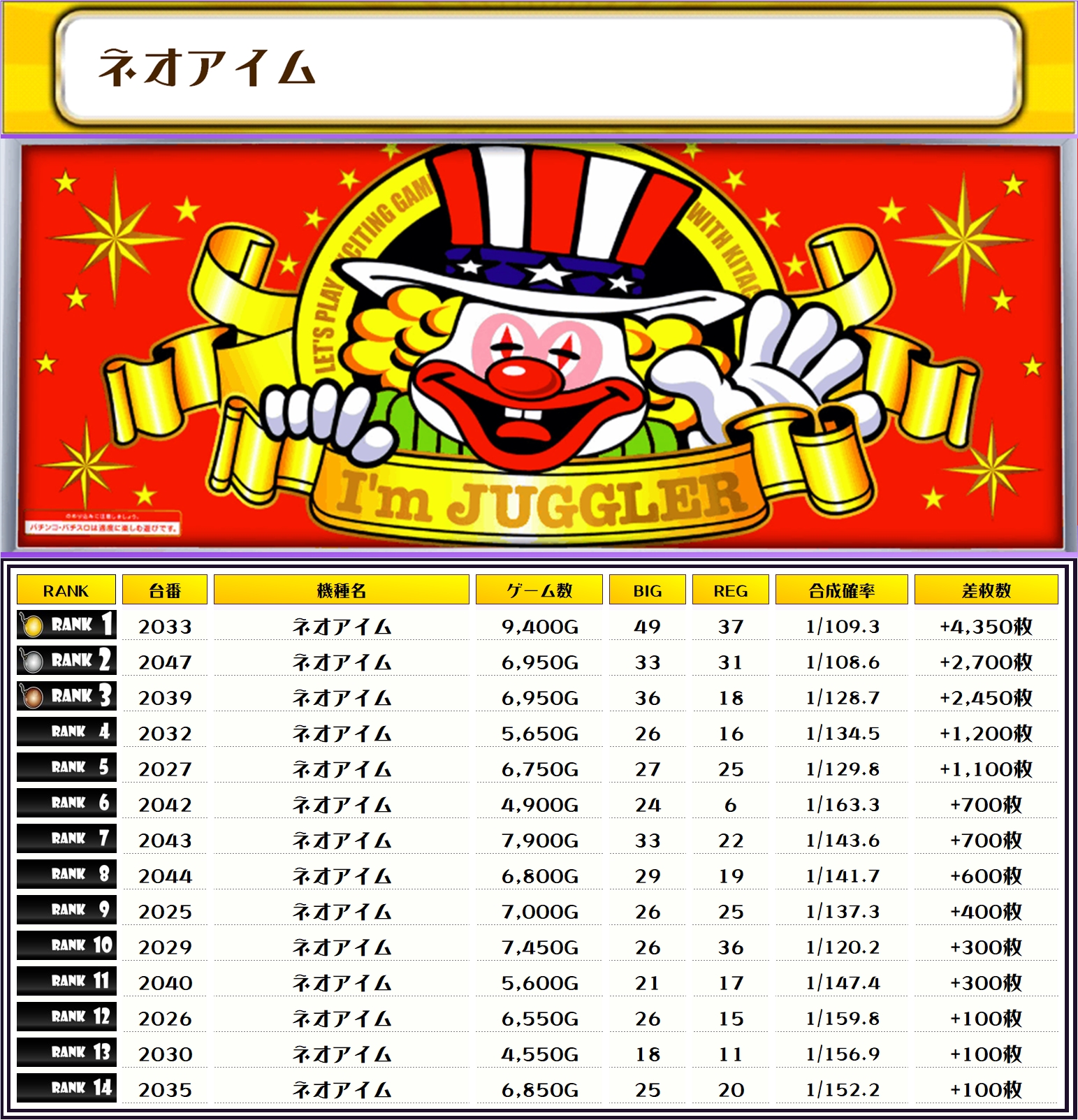 前回2/11は北斗転生2が万枚越えを達成!! さらにマイジャグやネオアイムが好調だったな👀 今回も楽しみだぜっ✨