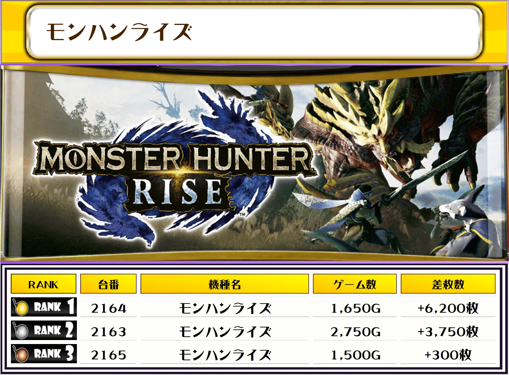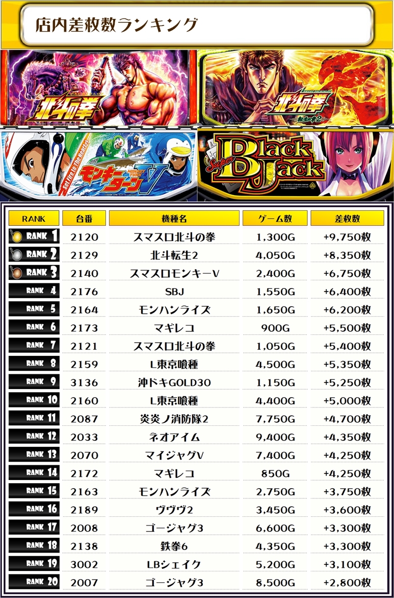 2位には北斗転生2・2129番台】の+8,350枚、3位には【スマスロモンキーV・2140番台】の+6,750枚がランクインっ🏆🏆🏆🏆