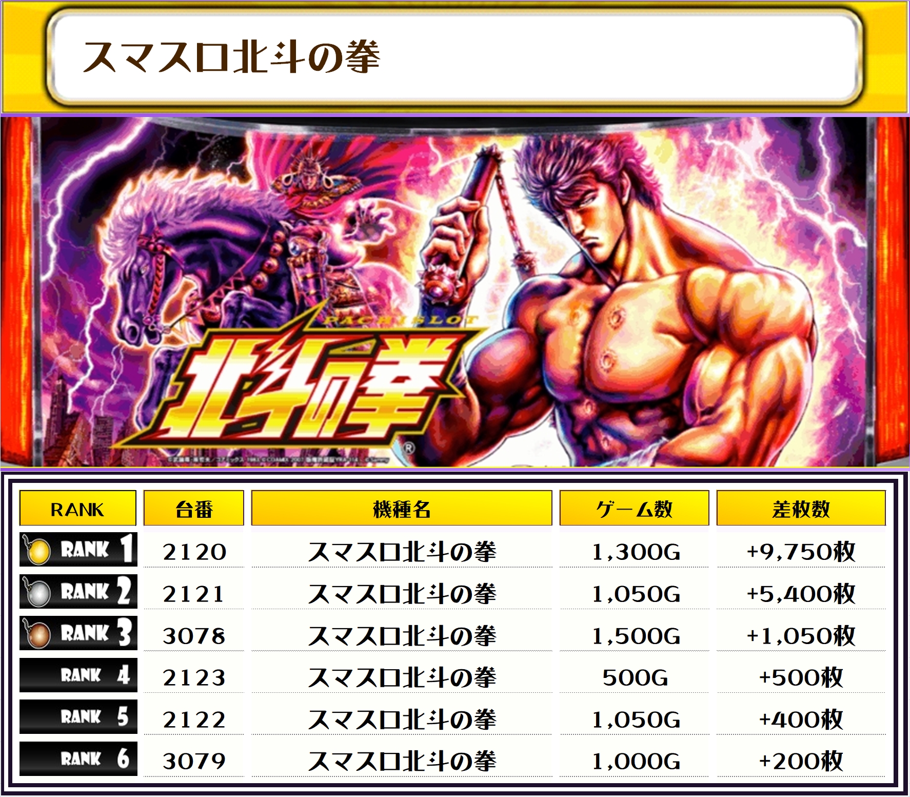 この日、全体の差枚トップに輝いたのは【スマスロ北斗の拳・2120番台】の+9,750枚‼️