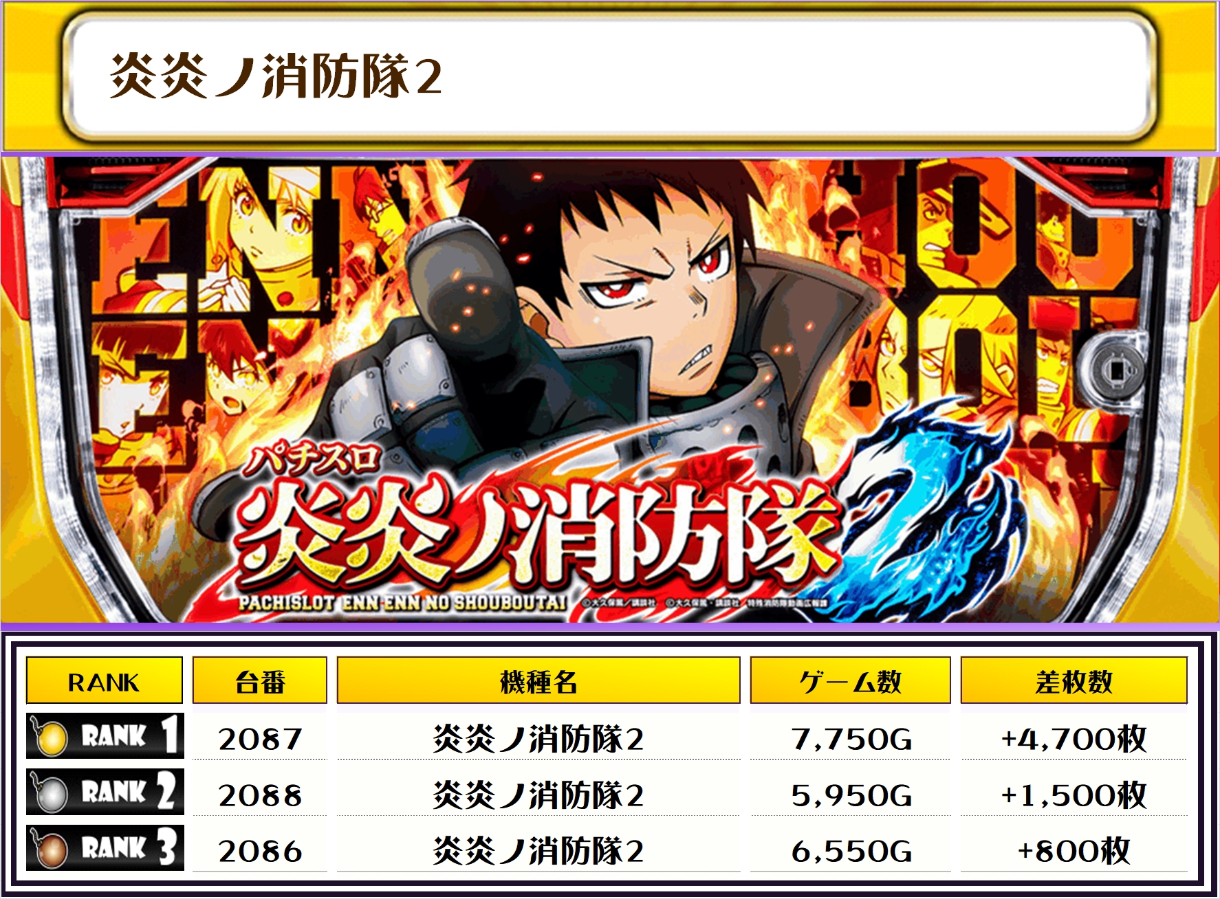 炎ノ消防隊2・マギレコ・スマスロ北斗の拳・モンキーターンなど定番の人気機種から、マイジャグ・ネオアイム・クランキークレストなどのノーマルタイプまで広い範囲から優秀台が確認できましたね✨