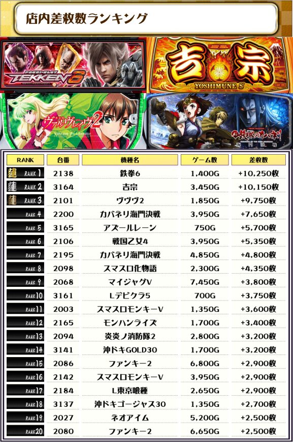 2位には【吉宗・3164番台】の+10,150枚、3位には【ヴヴヴ2・2101番台】の+9,750枚がランクインっ🏆🏆🏆🏆
