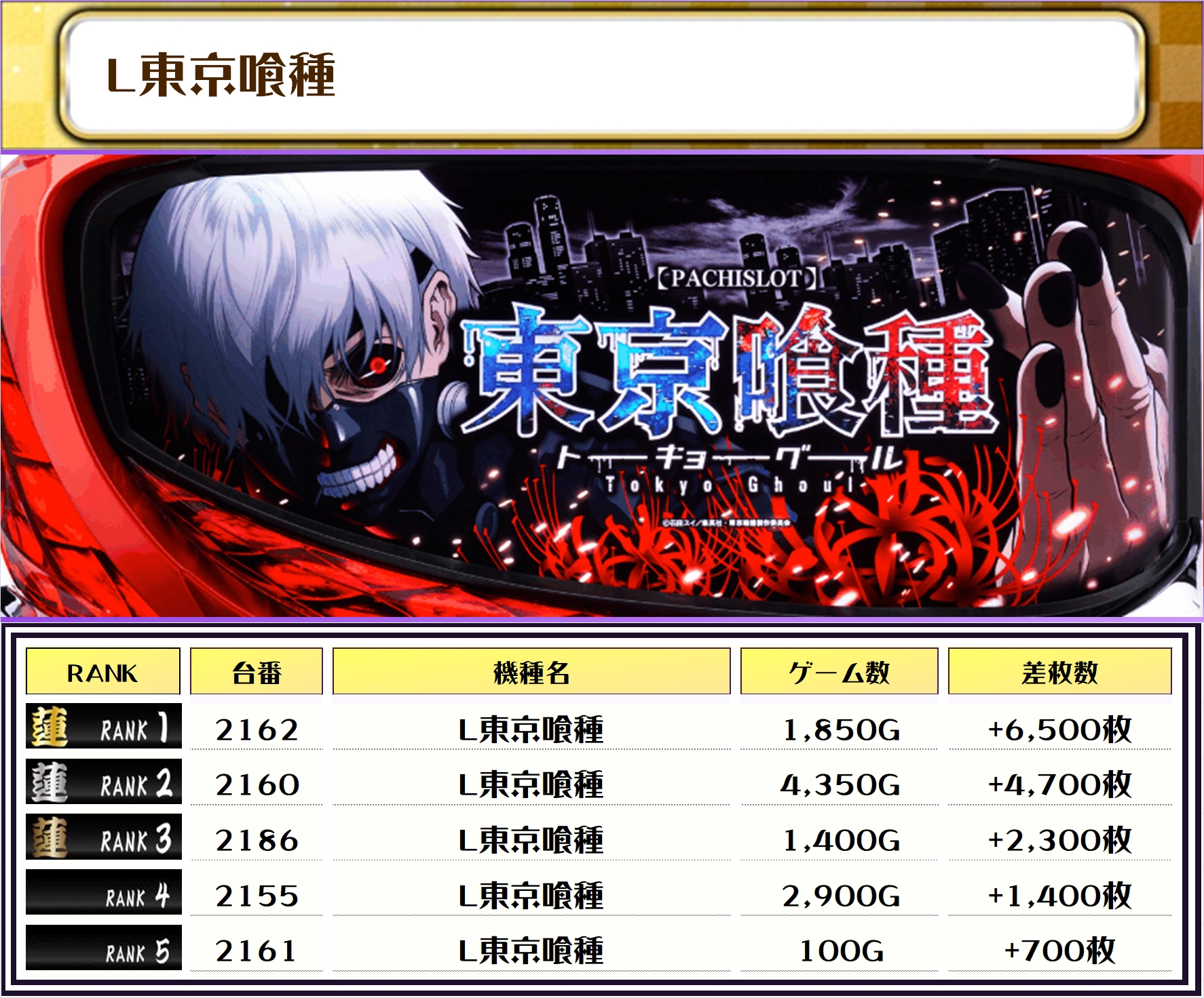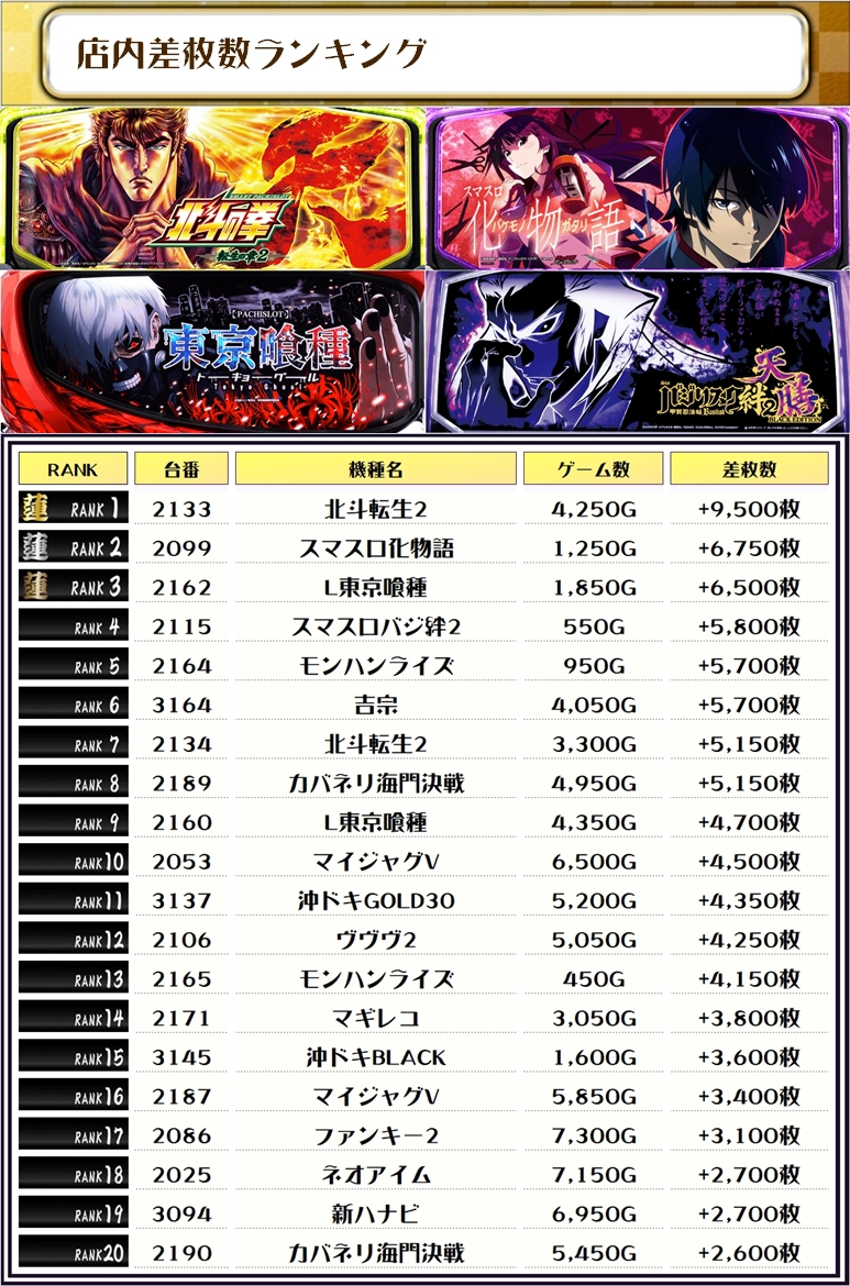 2位には【スマスロ化物語・2099番台】の+6,750枚、3位には【L東京喰種・2162番台】の+6,500枚がランクインっ🏆🏆🏆🏆