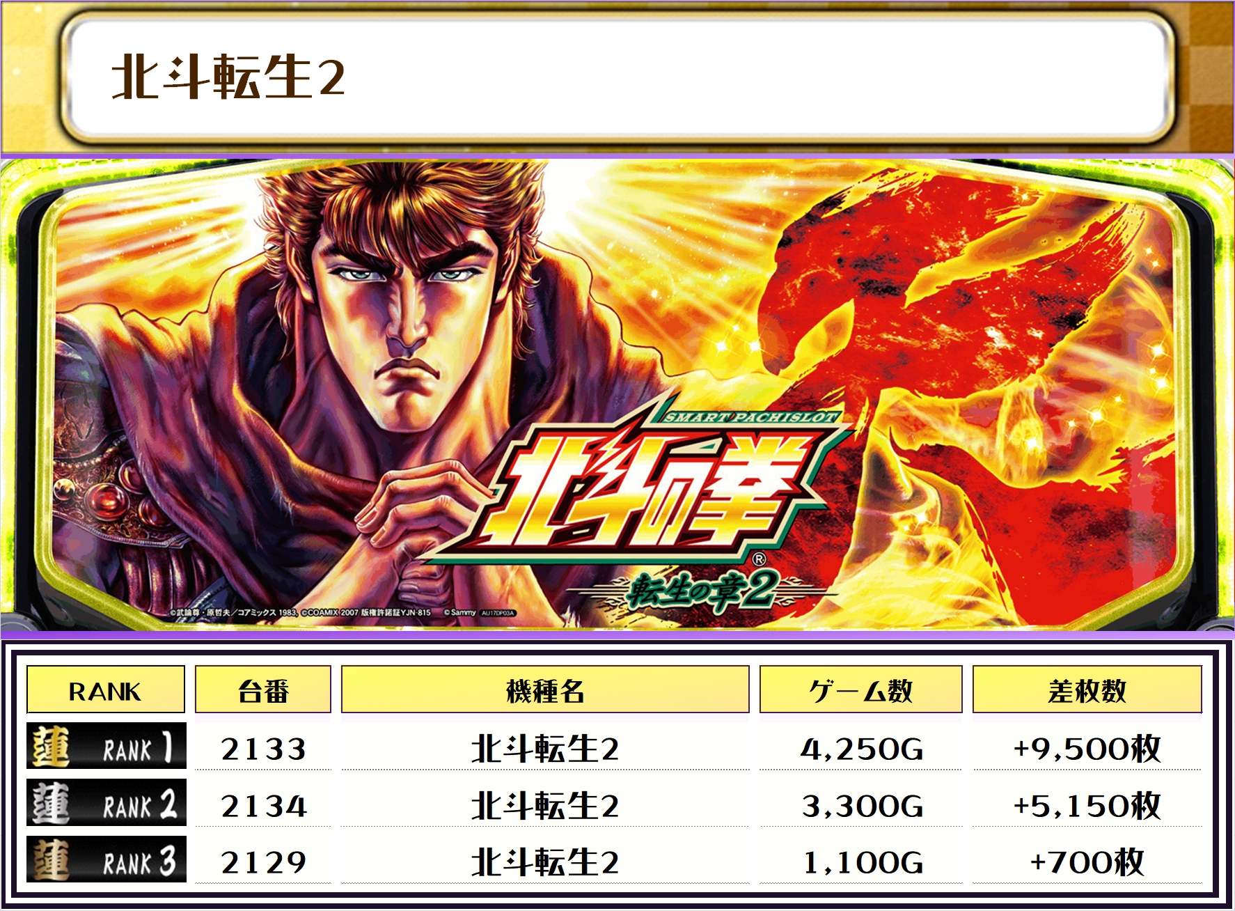 この日、全体の差枚トップに輝いたのは【北斗転生2・2133番台】の+9,500枚‼️