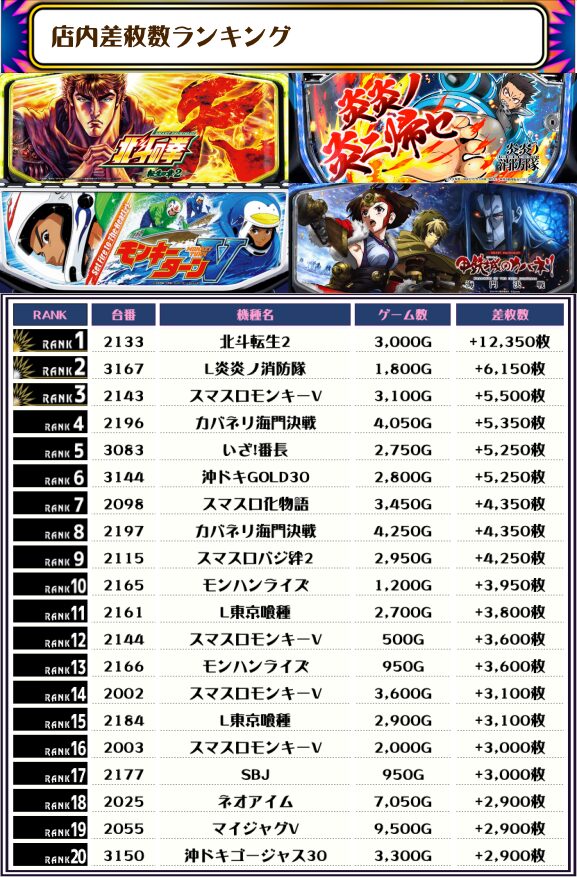 続く2位には【L炎炎ノ消防隊・3167番台】の+6,150枚、3位は【スマスロモンキーV・2143番台】の+5,500枚がランクインですっ❗️