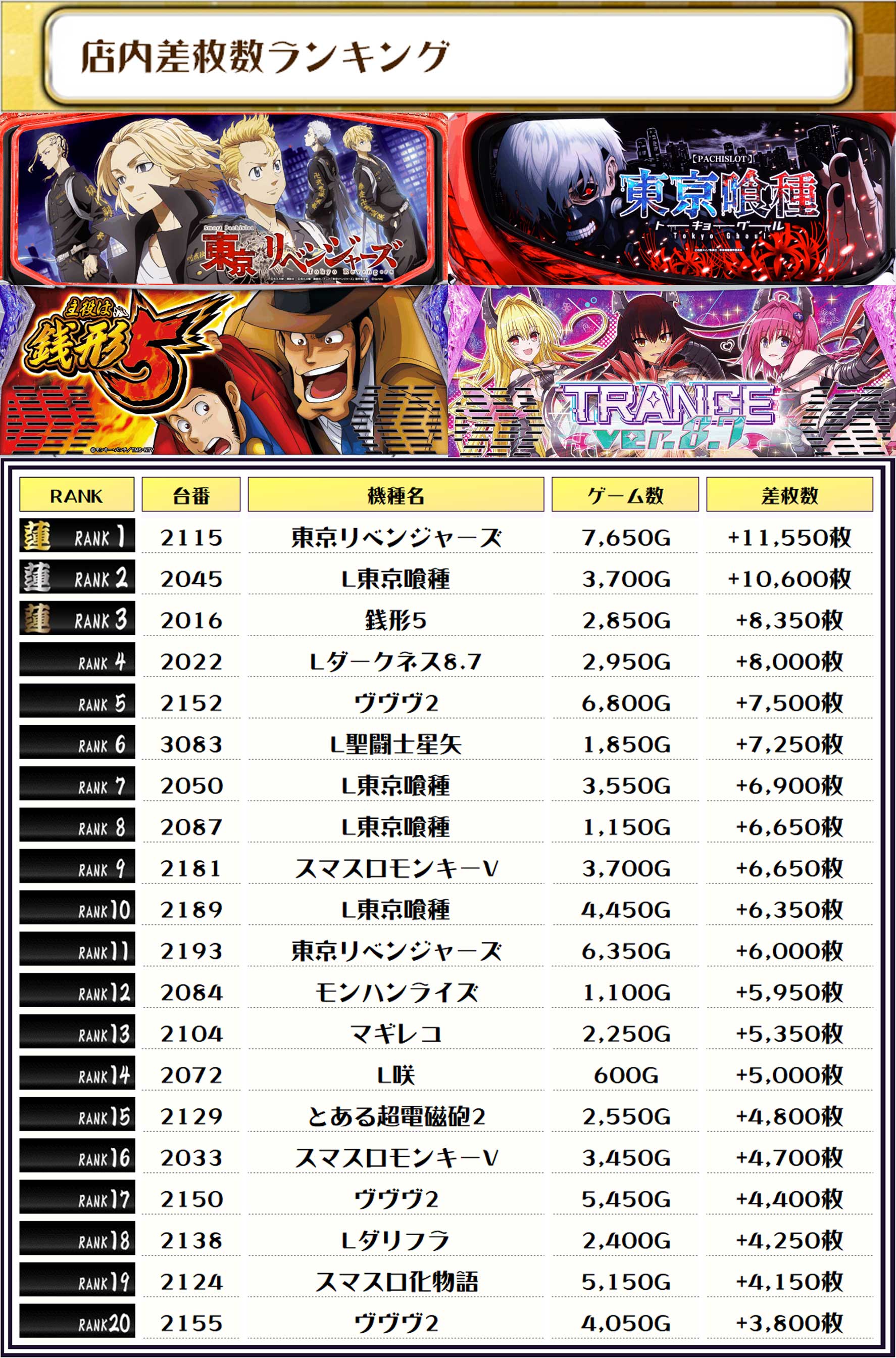 この日、全体の差枚トップに輝いたのは【東京リベンジャーズ・2115番台】で+11,550枚‼️👑👑👑