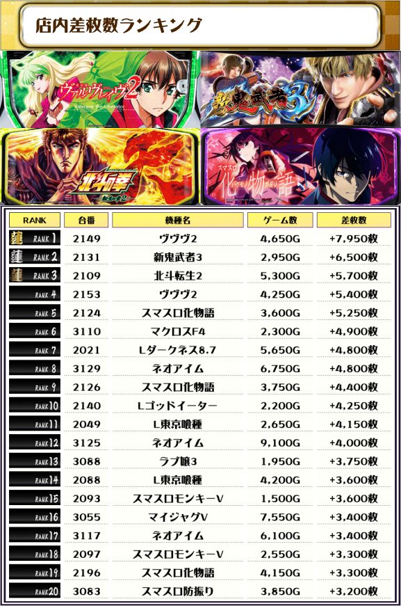 2位には【新鬼武者3・2131番台】の+6,500枚、そして3位には【北斗転生2・2109番台】の+5,700枚がランクインっ🏆🏆🏆🏆