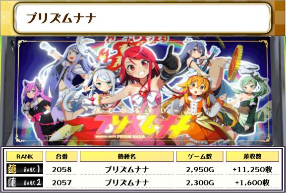 この日、全体の差枚トップに輝いたのは【プリズムナナ・2058番台】で+11,250枚‼️👑👑👑