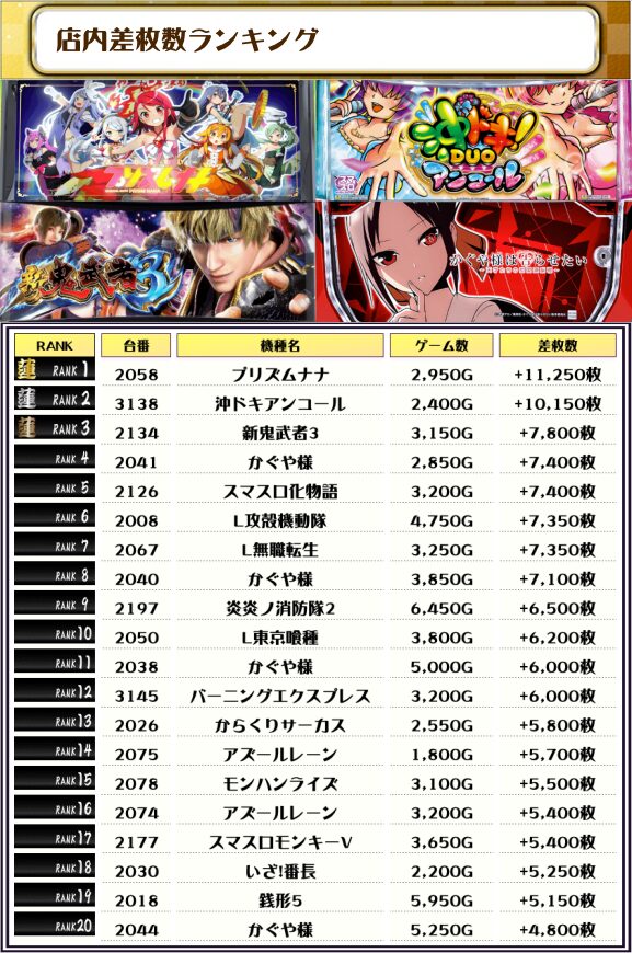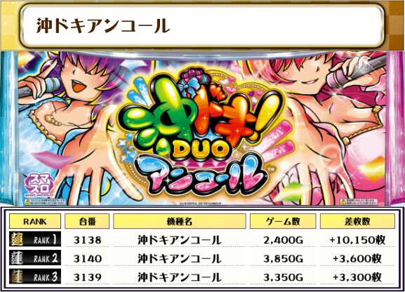 2位には【沖ドキアンコール・3138番台】の+10,150枚、そして3位には【新鬼武者3・2134番台】の+7,800枚がランクインっ🏆🏆🏆🏆