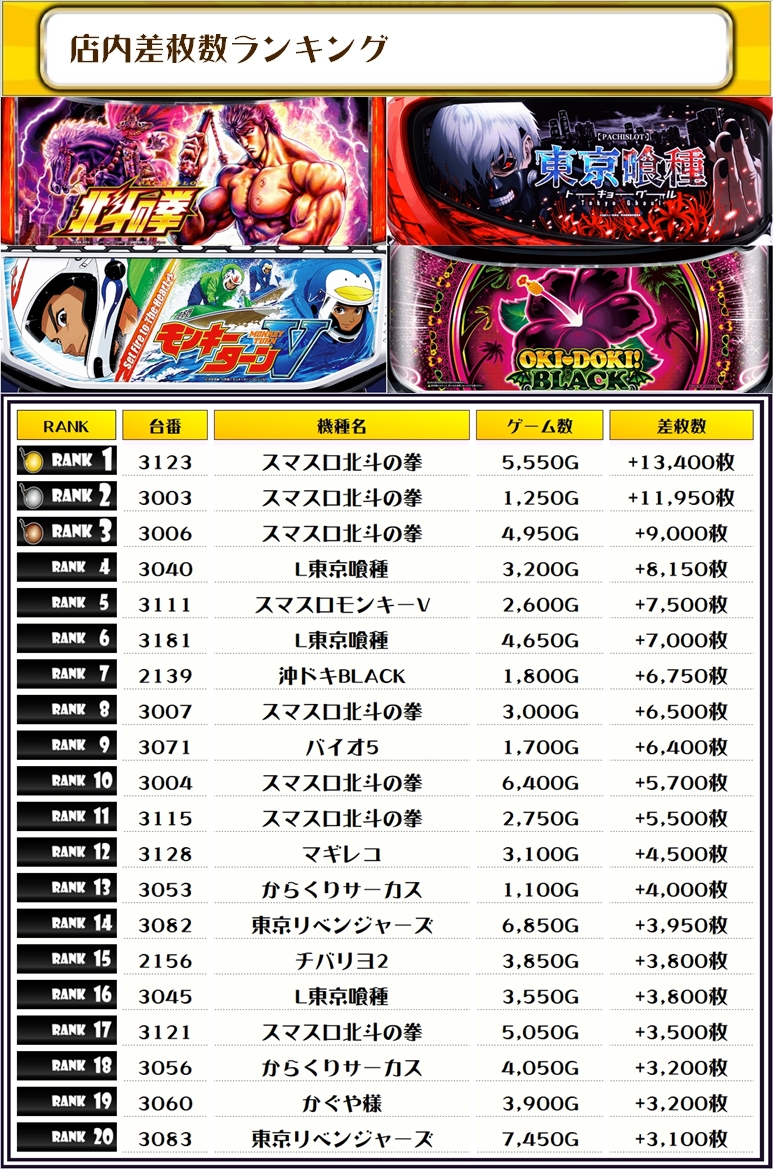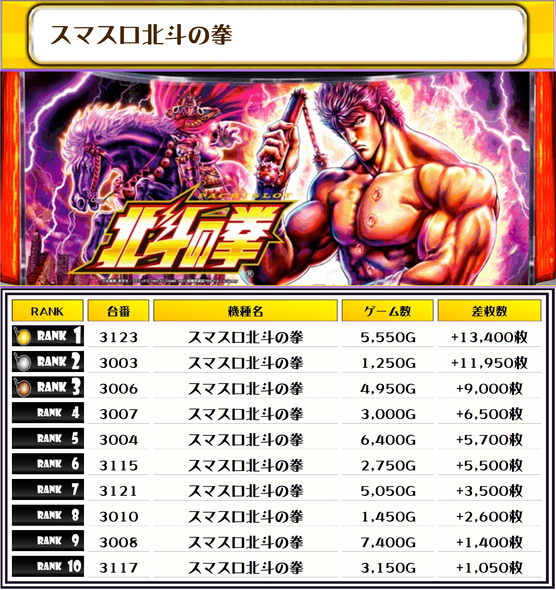 続く2位には同じく【スマスロ北斗の拳・3003番台】の+11,950枚、そして3位にはまたまた【スマスロ北斗の拳・3006番台】の+9,000枚がランクインしましたっ❗️