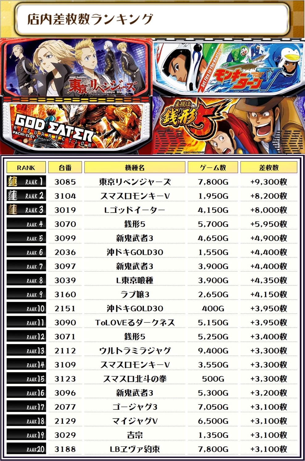 パチスロ全体のTOP差枚は【東京リベンジャーズ・3085番台】で差枚は+9,300枚を獲得っ❗️