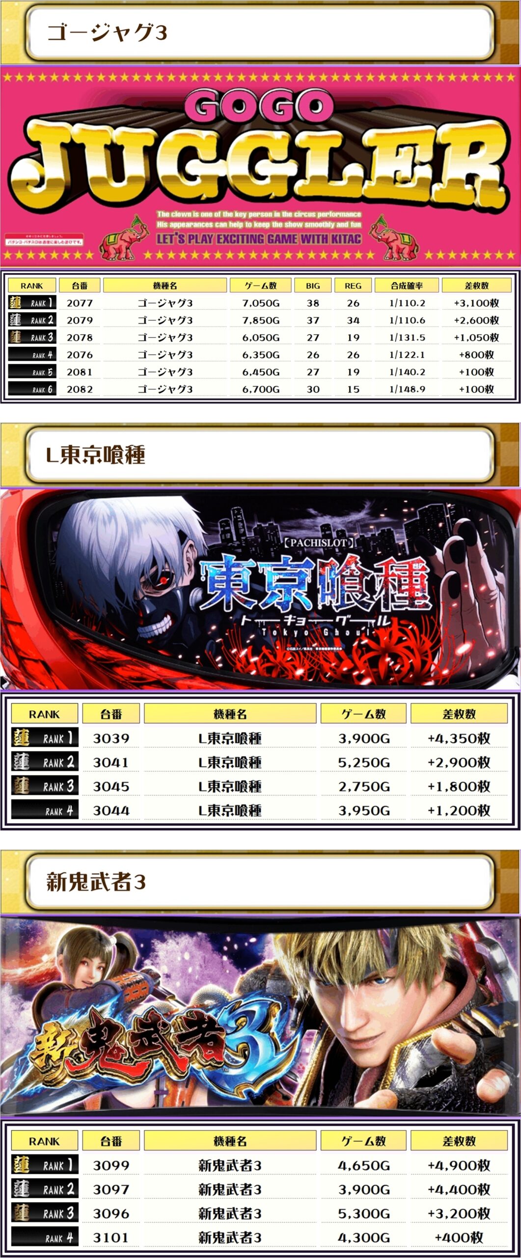さらに、ゴージャグ・沖ドキGOLD・東京喰種・新鬼武者3にも優秀台が並んでいたような?👀