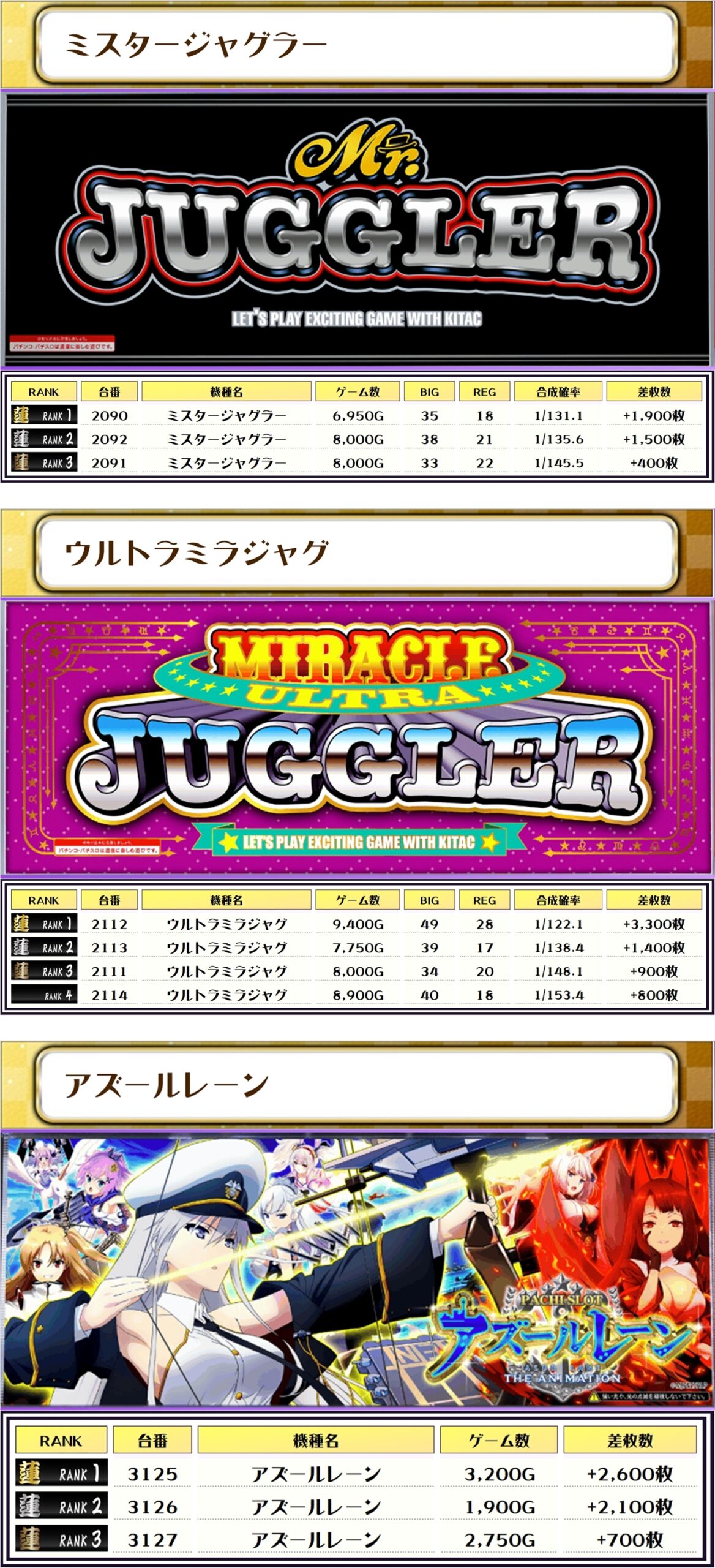 ミスタージャグラー・ウルトラミラジャグ・アズールレーンはどれも全台の差枚がプラス、おそらく全台系だったと思われます✨👑👑👑