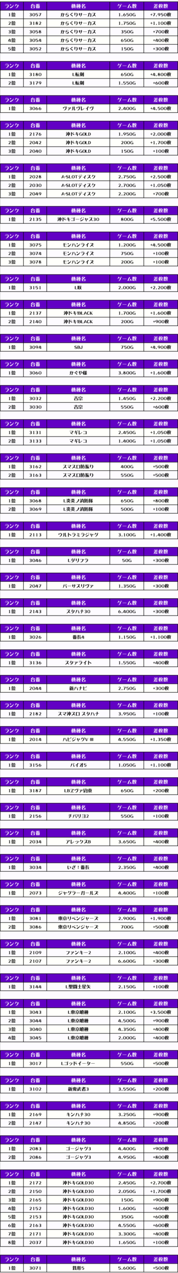 2位には沖ドキゴージャス30・2135番台の+5,500枚、3位はSBJ・3094番台】の+4,900枚がランクインしましたっ❗️
