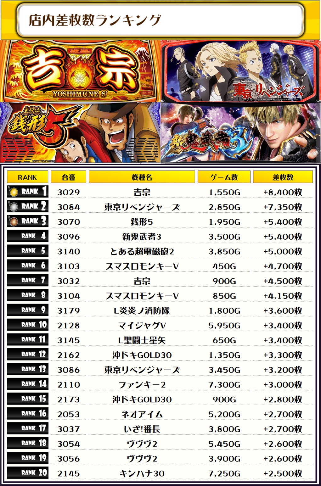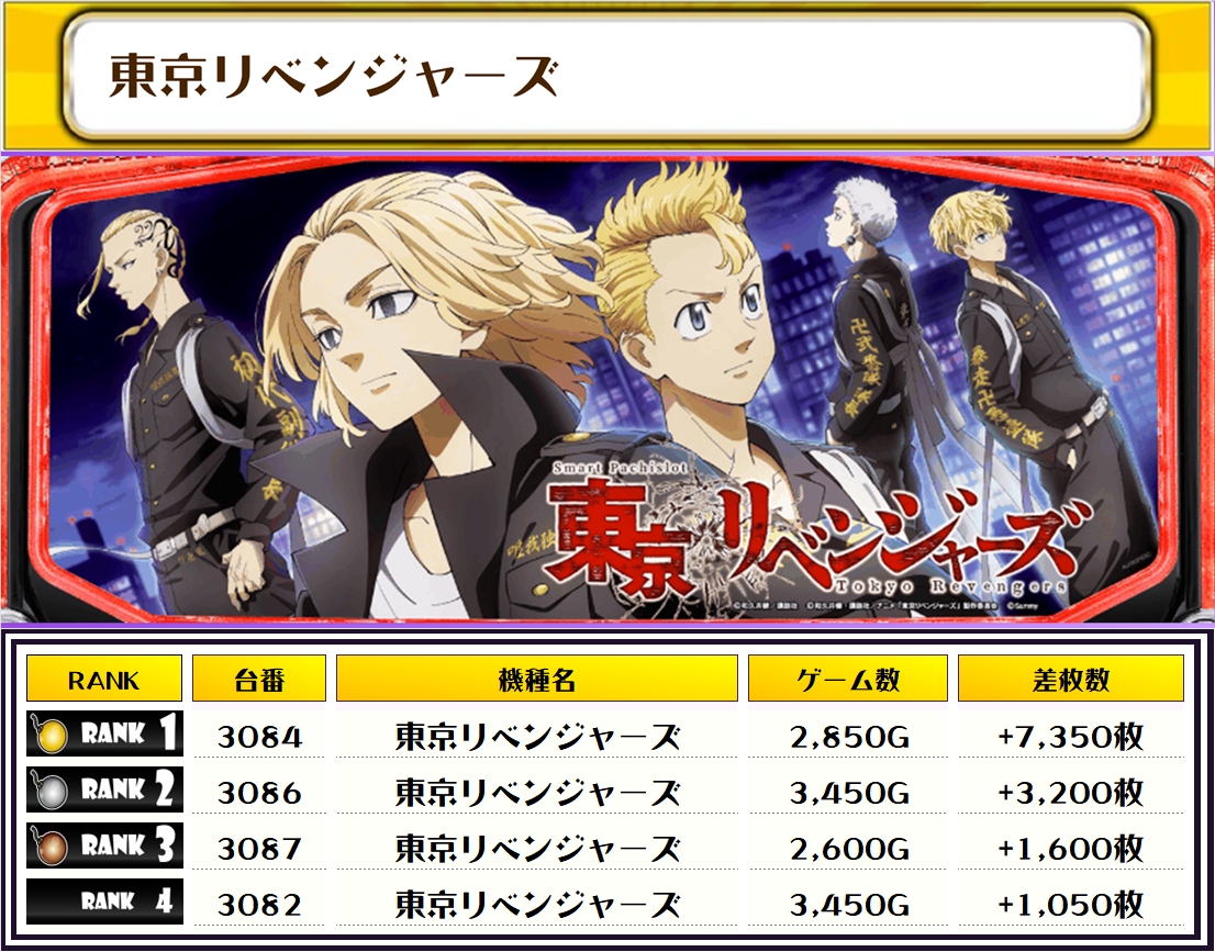 続く2位には【東京リベンジャーズ・3084番台】の+7,350枚、そして3位には【銭形5・3070番台】の+5,400枚がランクインしましたっ❗️