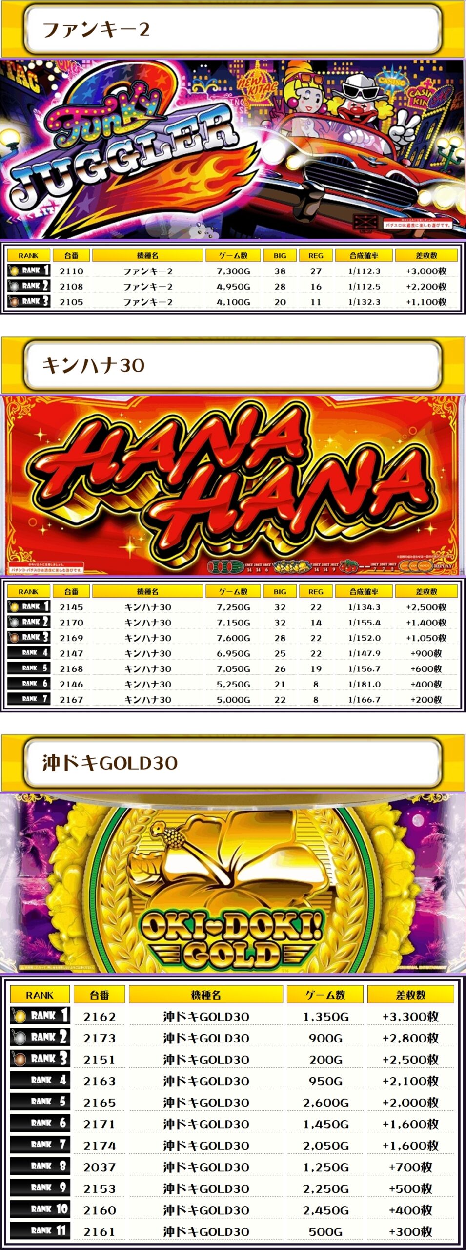 あと、沖ドキGOLD30とキンハナ30、ファンキー2、東京リベンジャーズもかなり優秀台が多かったな🎉 見た感じでは1/2以上はあったみたいな印象だったぜ💡