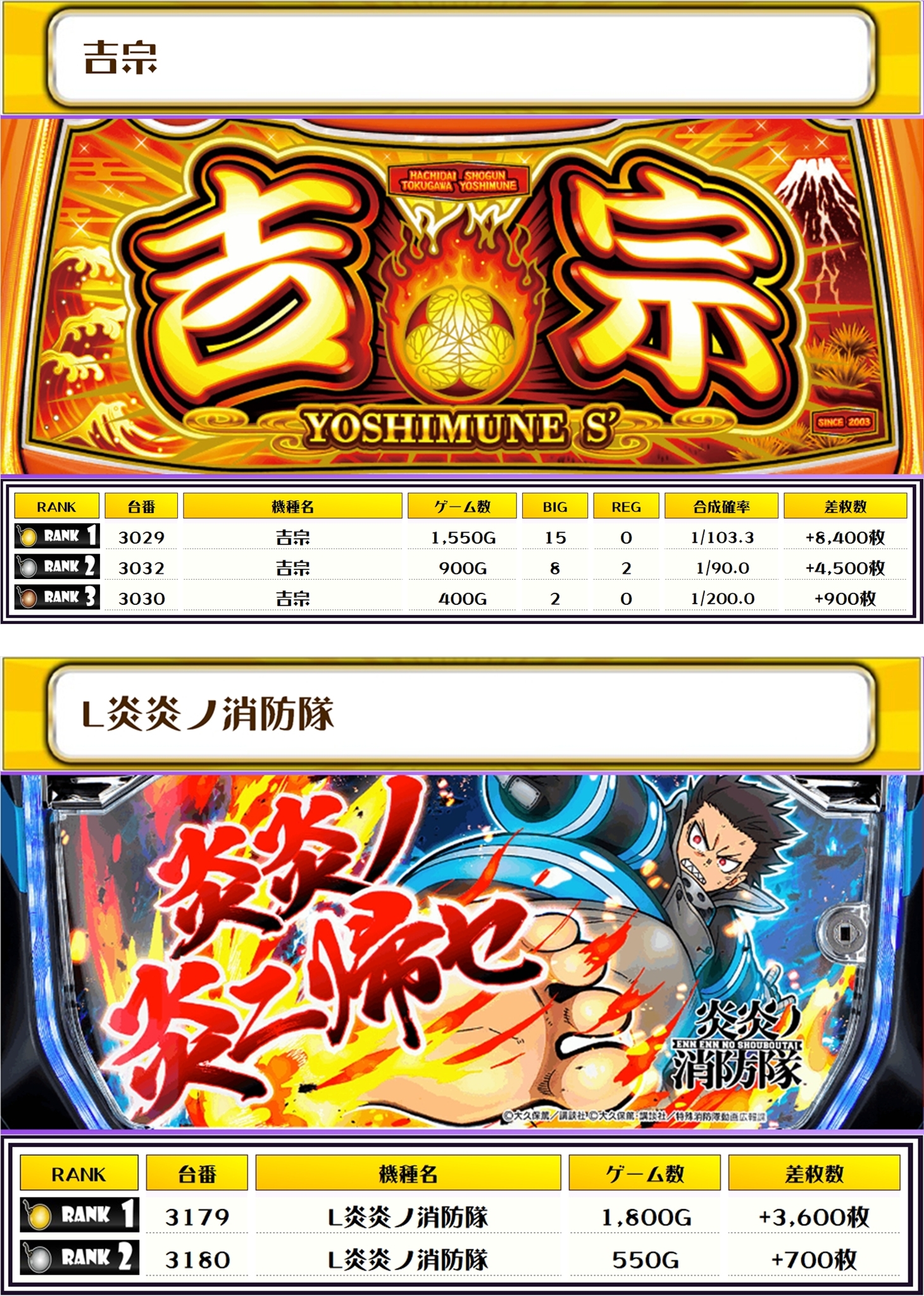 今回はピックアップ機種からお分かりの通り、吉宗とL炎炎ノ消防隊がかなり盛り上がっていたぜっ👑👑👑 全部だったんじゃないかと睨んでる👀