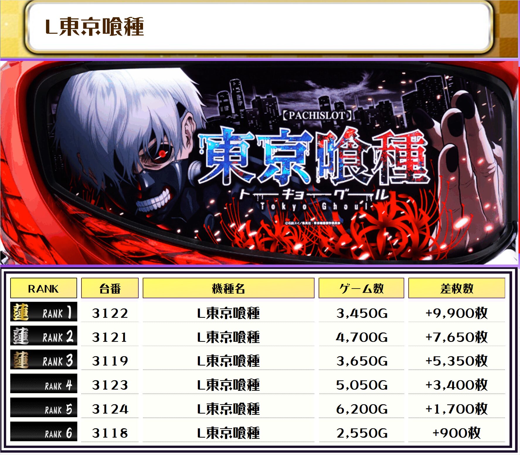 続く2位には【L東京喰種・3122番台】の+9,900枚、そして3位も【L東京喰種・3121番台】の+7,650枚がランクインしましたっ💖