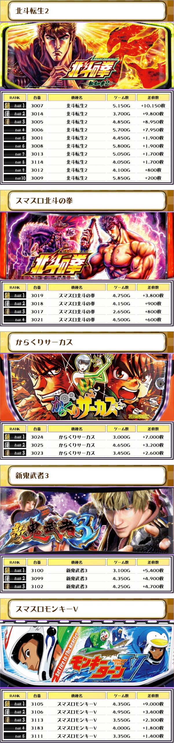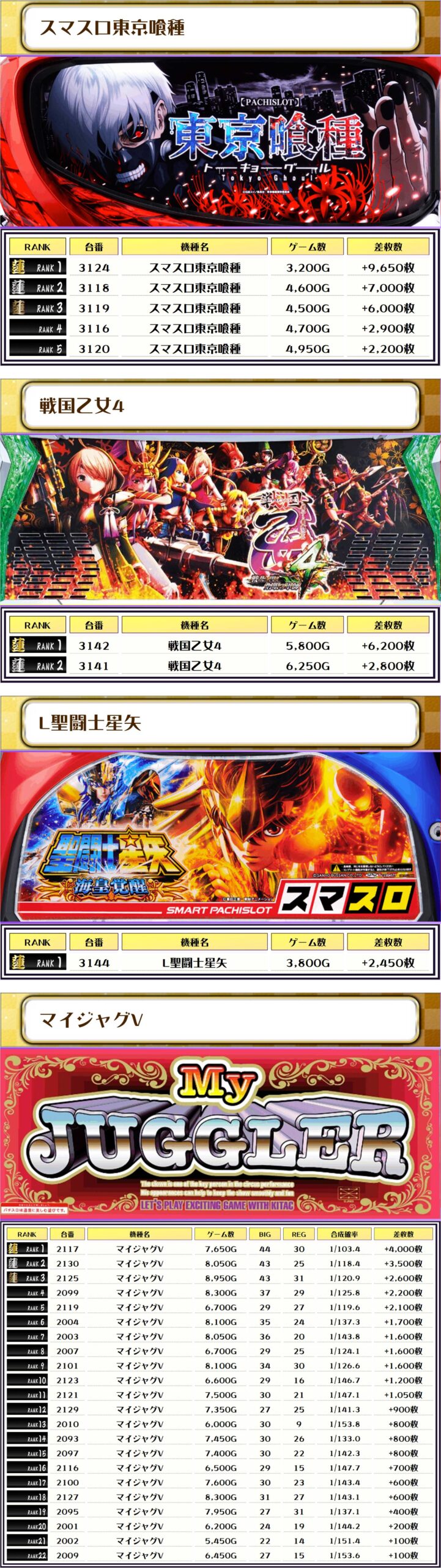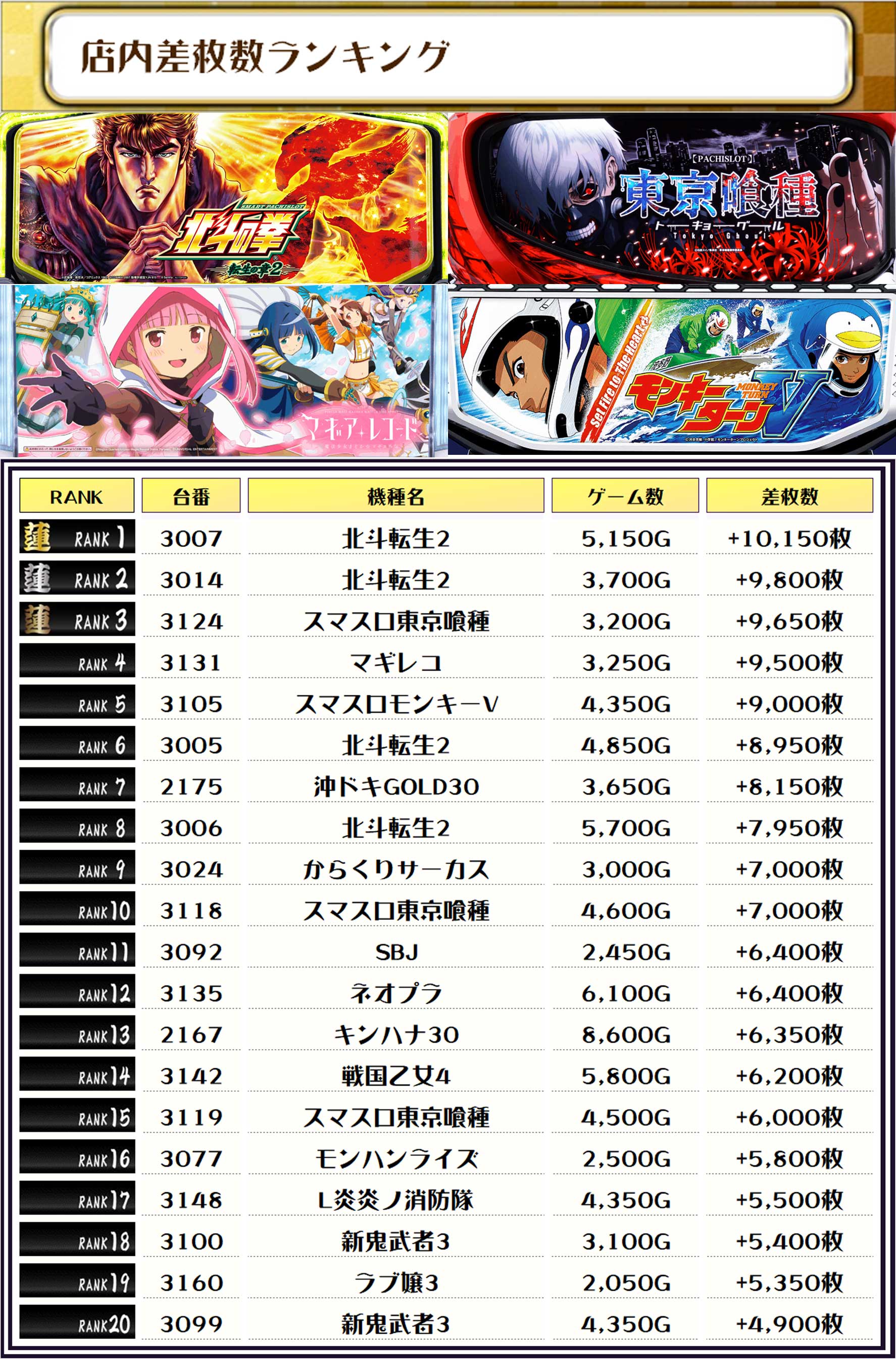 2位には同じく【北斗転生2・3014番台】の+9,800枚、そして3位には【スマスロ東京喰種・3124番台】の+9,650枚がランクインしましたっ❗️