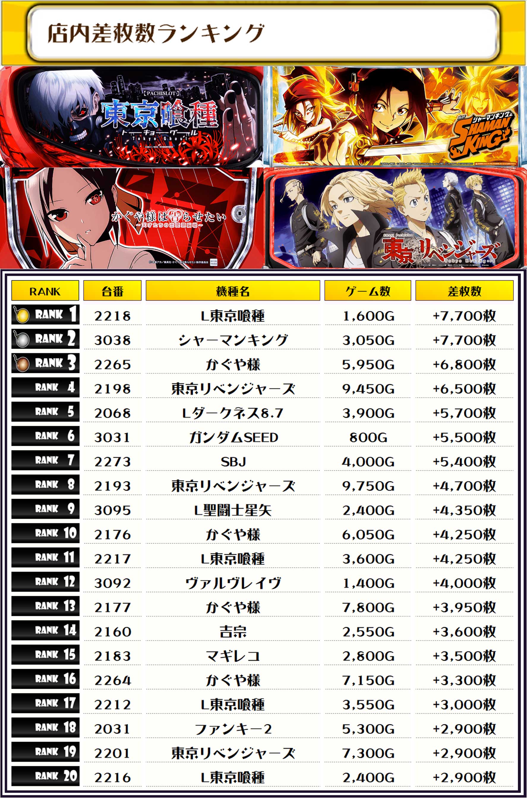 全体のTOP差枚は【L東京喰種・2218番台】で+7,700枚を獲得っ❗️