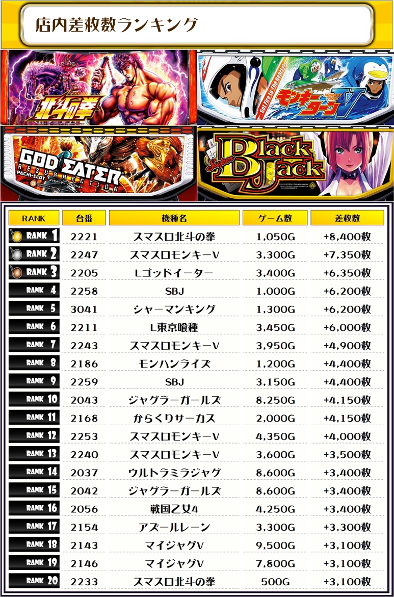 全体のTOP差枚は【スマスロ北斗の拳・2221番台】で+8,400枚を獲得っ❗️