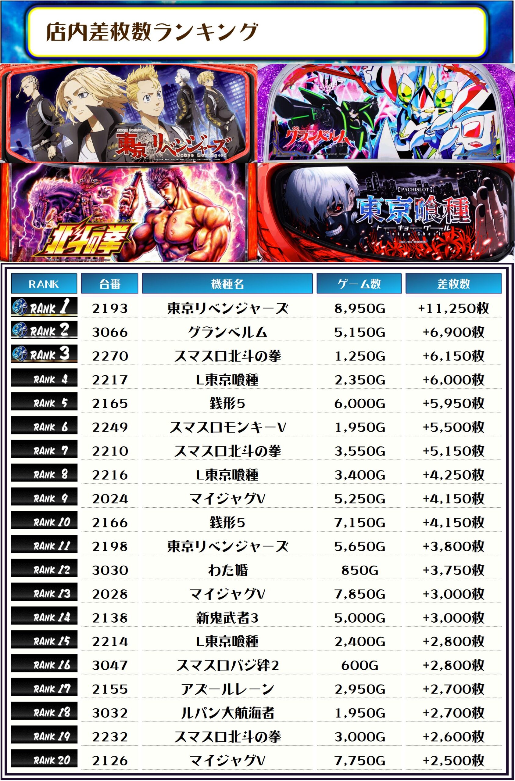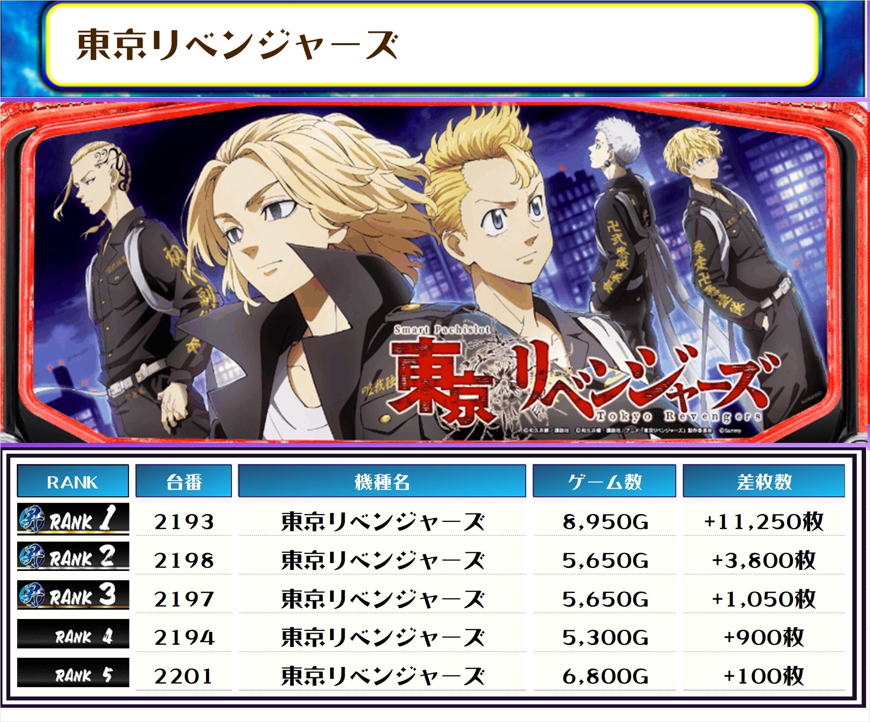 全体のTOP差枚は【東京リベンジャーズ・2193番台】で差枚は+11,250枚を獲得っ❗️