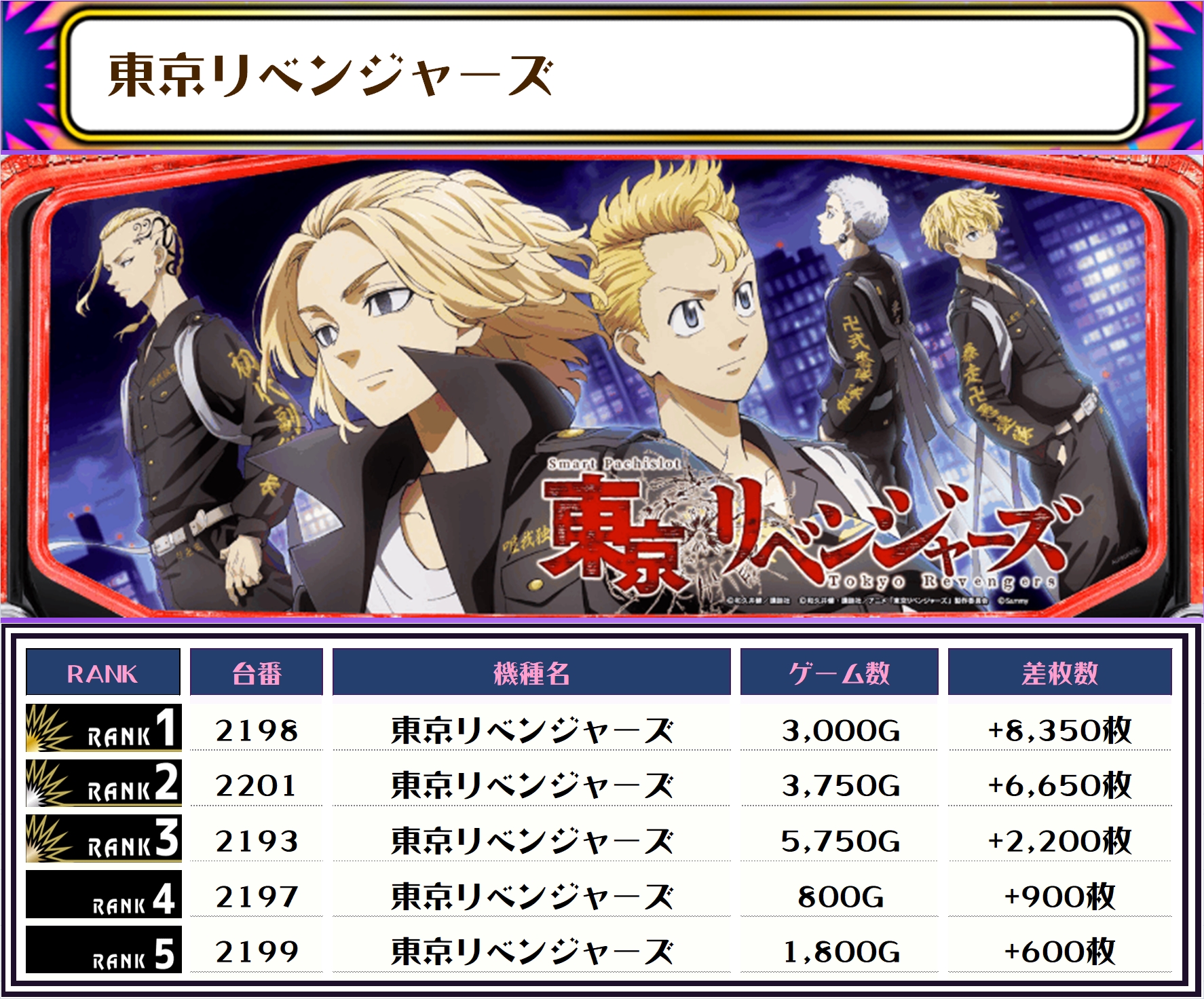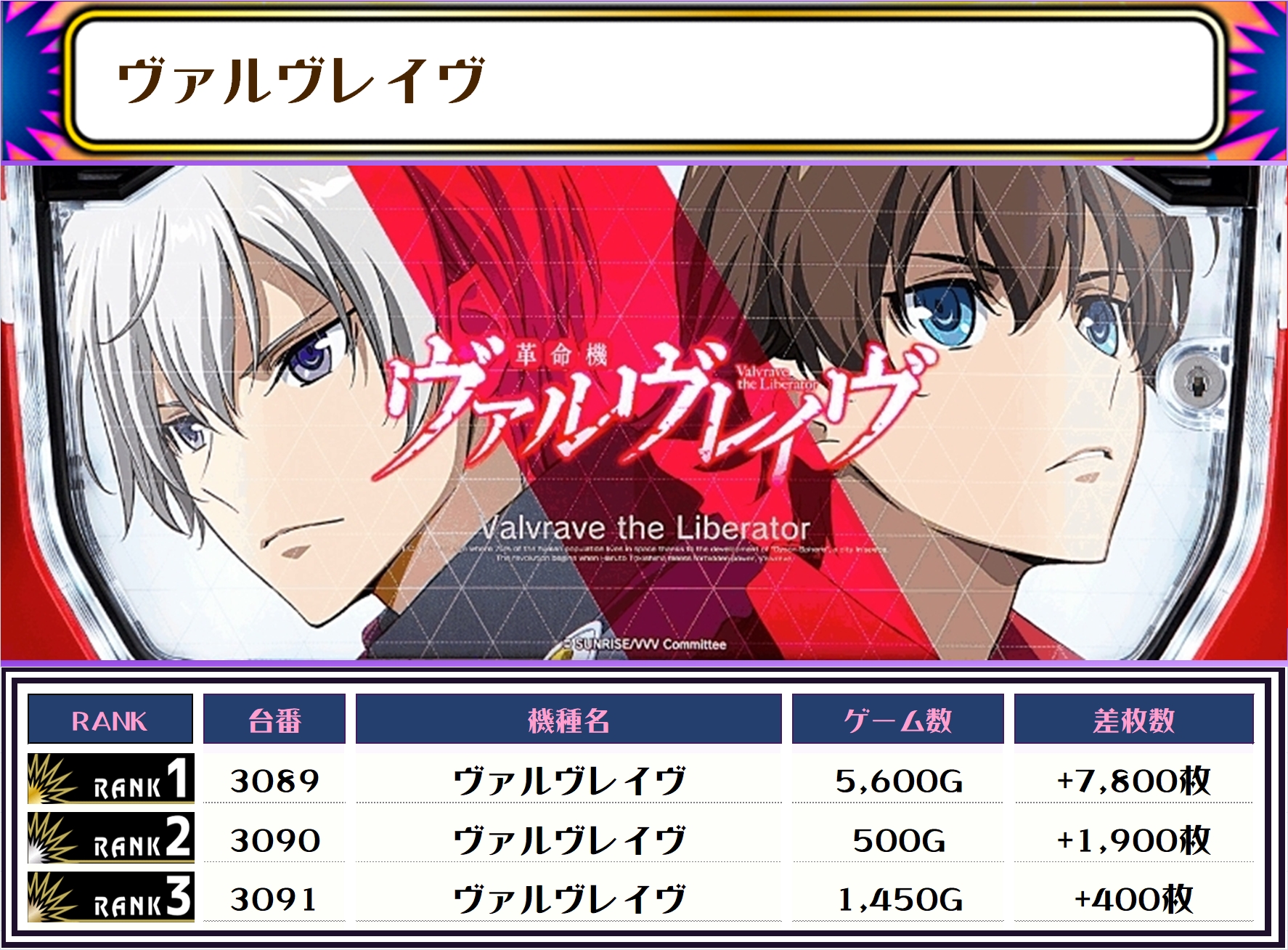 どうやら、ヴァルヴレイヴは3台全てがプラス差枚で全台系の気配がありますね✨ さらに東京リベンジャーズは半数以上が優秀台だったようです✅