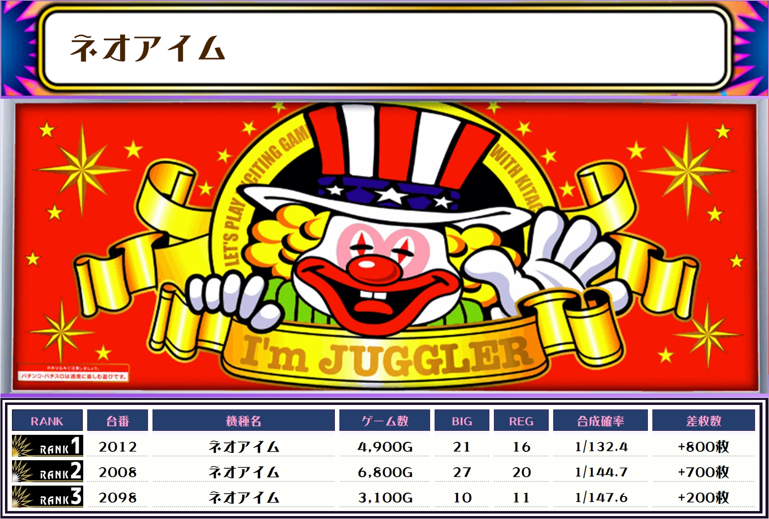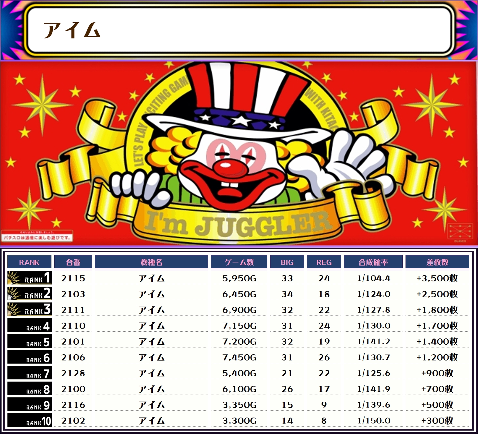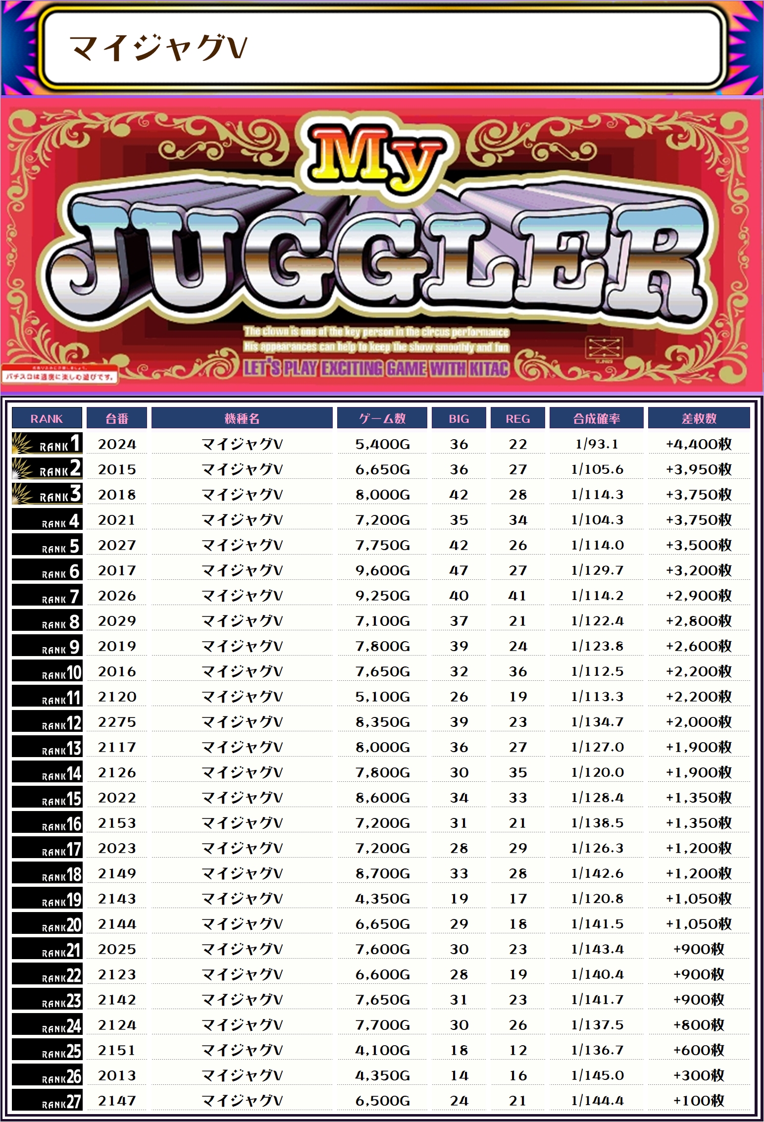 TOP3が全て万枚越えを達成🔥🔥🔥 マイジャグは43台中27台がプラスで平均差枚が約1000枚と優秀な結果でした👏👏👏