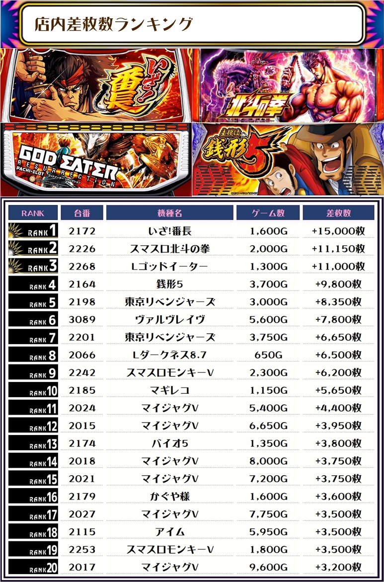 全体のTOP差枚は【いざ!番長・2172番台】で差枚は+15,000枚を獲得っ❗️