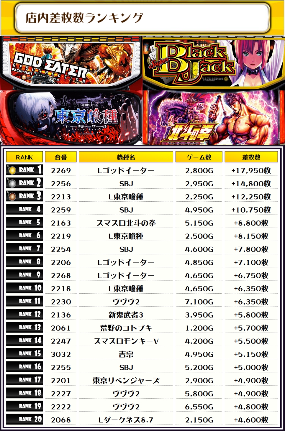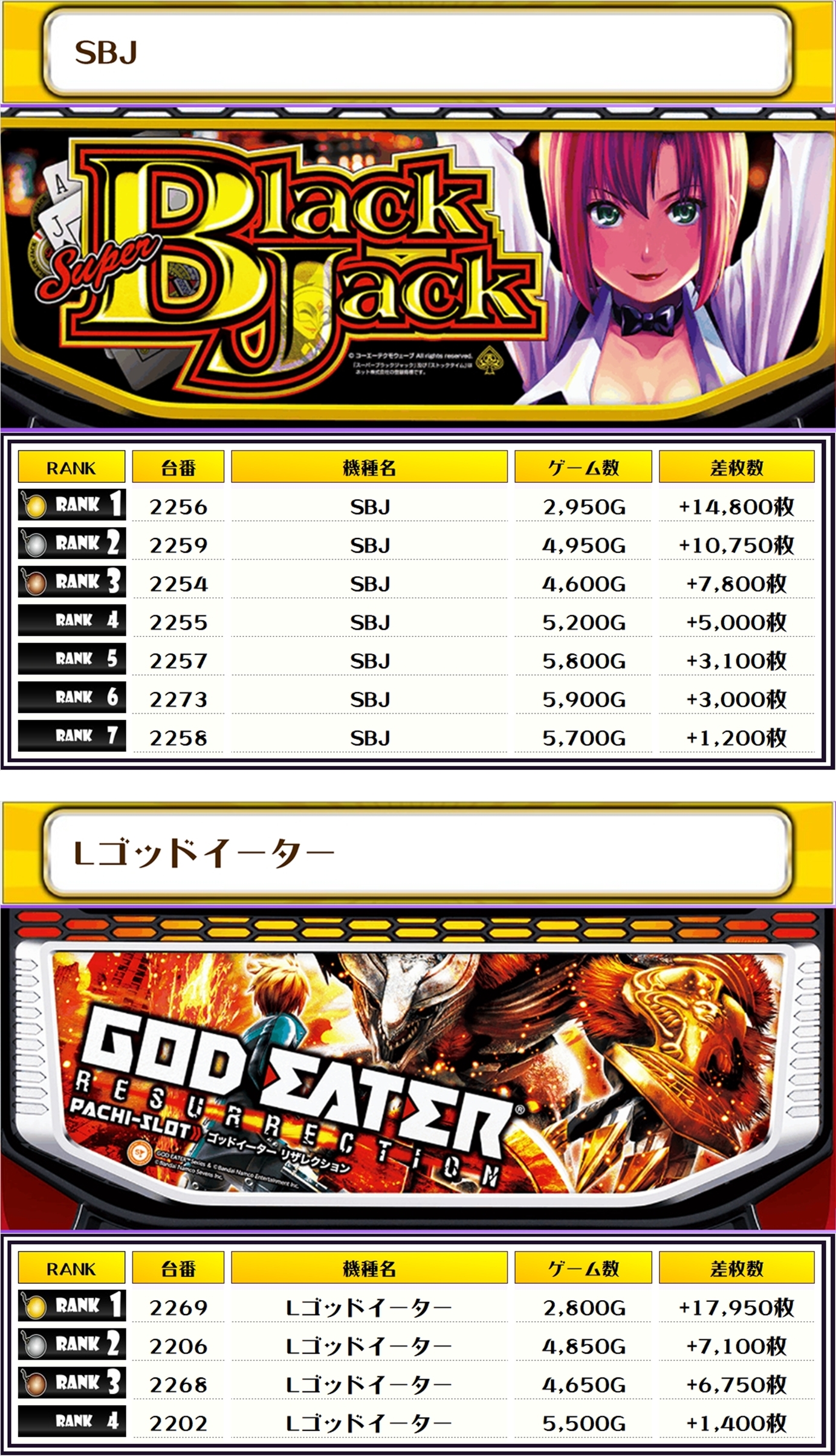 全体のTOP差枚は【Lゴッドイーター・2269番台】で差枚は+17,960枚を獲得じゃっ❗️