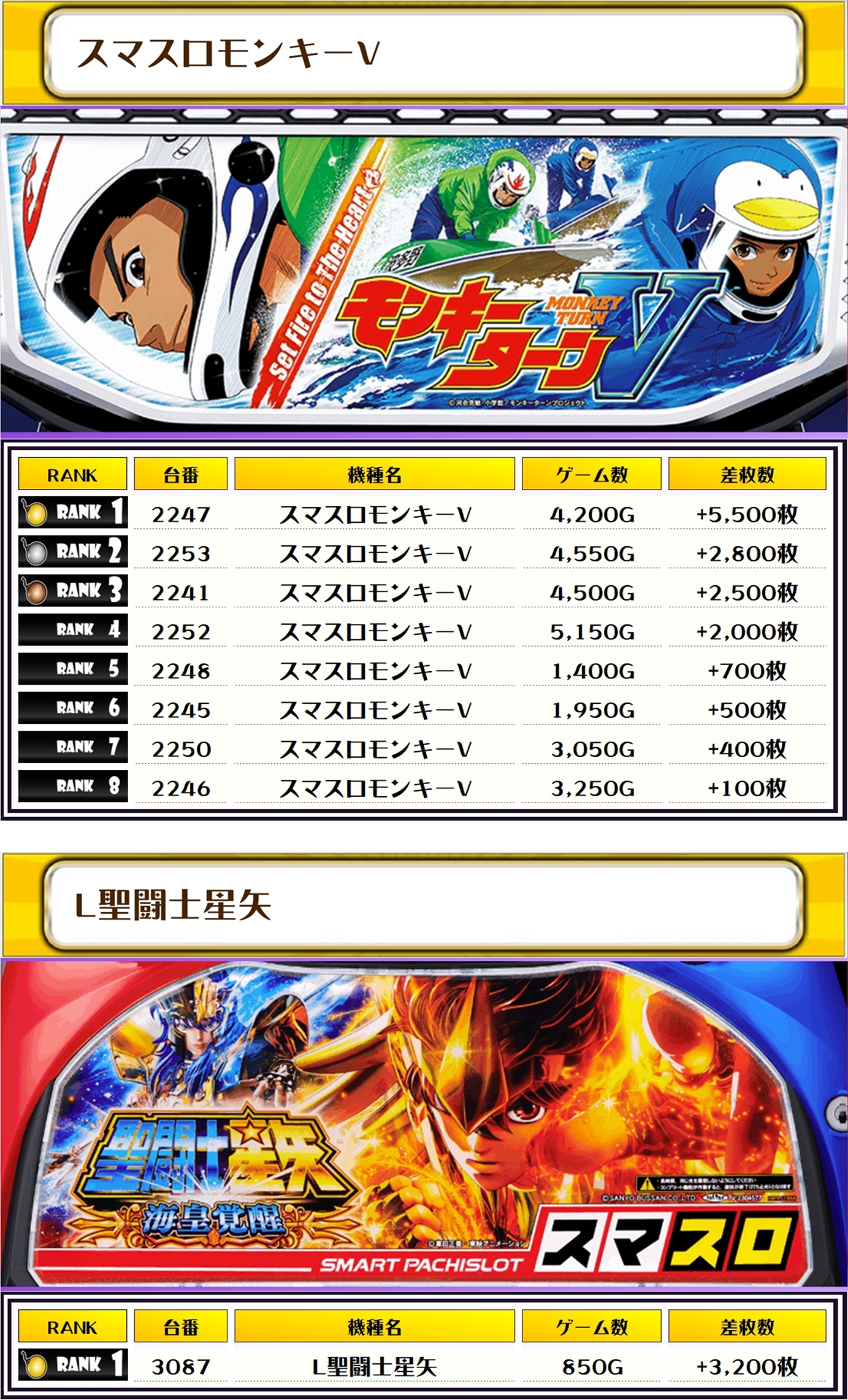 どうやら、モンキーV・マイジャグ・東京喰種・聖闘士星矢・新鬼武者3も勝率がよく、稼働も良好だったように見えるのぅ✅
